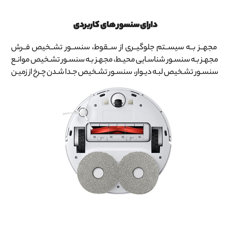 | سایر اقلام همراه محصول | برس یک عددپوشش برس یک عددمحفظه گرد و غبار یک عددمخزن آب یک عددبرس کناری یک عددابزار تمیز کردن یک عددسیم برقیک عددMop Pad (از پیش نصب شده) دو عددنگهدارنده موپ پد دو عددداک شارژ دو عدد |