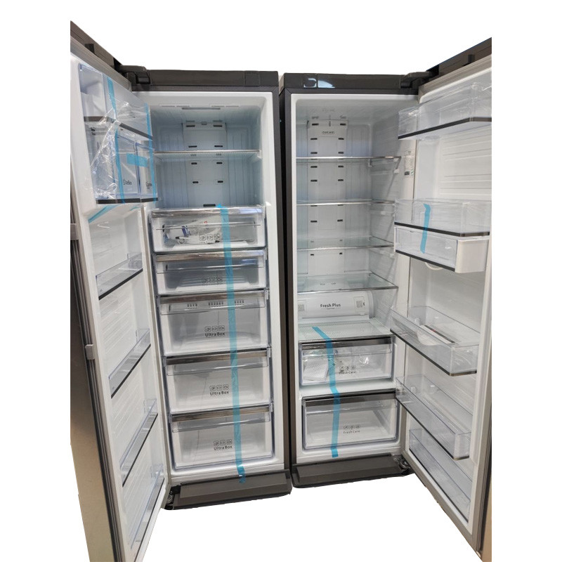 حضور قدرتمند و متقارن دو واحد مجزای یخچال و فریزر SRI/SFI-20SS، در همان نگاه اول، حس وسعت، نظم و تکنولوژی پیشرفته را القا میکند. طراحی این مجموعه با دقت و ظرافتی مثالزدنی انجام شده است. "نمایشگر بلند آینهای لمسی" که به زیبایی بر روی درب یکی از واحدها قرار گرفته، نه تنها جلوهای از مدرنیته و زیبایی را به آشپزخانه شما میافزاید، بلکه به عنوان رابط کاربری اصلی و مرکز کنترل هوشمند دستگاه عمل میکند. از طریق این نمایشگر، کاربران میتوانند به راحتی به تنظیمات دما، حالتهای عملکرد و سایر قابلیتهای هوشمند دسترسی پیدا کنند. طبقات شیشهای بدون قاب در فضای داخلی، علاوه بر ایجاد ظاهری تمیز و وسیع، به دید بهتر و تمیزکاری آسانتر کمک میکنند. با ارتفاع ۱۸۰ سانتیمتر، عرض کلی ۱۲۰ سانتیمتر و عمق ۶۶ سانتیمتر، این مجموعه حضوری چشمگیر و در عین حال متناسب با آشپزخانههای جادار امروزی دارد. با مجموع گنجایش ۶۷۳ لیتر، این مجموعهی دوقلو فضای ذخیرهسازی بینظیری را ارائه میدهد. بخش یخچال با ظرفیت سخاوتمندانهی ۳۶۱ لیتر، شامل ۵ طبقهی شیشهای مقاوم و ۶ قفسهی جادار روی درب است که امکان نگهداری منظم انواع بطریها، ظروف و مواد غذایی کوچک و بزرگ را فراهم میکند. دو کشوی بزرگ هم برای نگهداری بهینهی میوهها و سبزیجات با حفظ رطوبت و تازگی ایدهآل طراحی شدهاند.