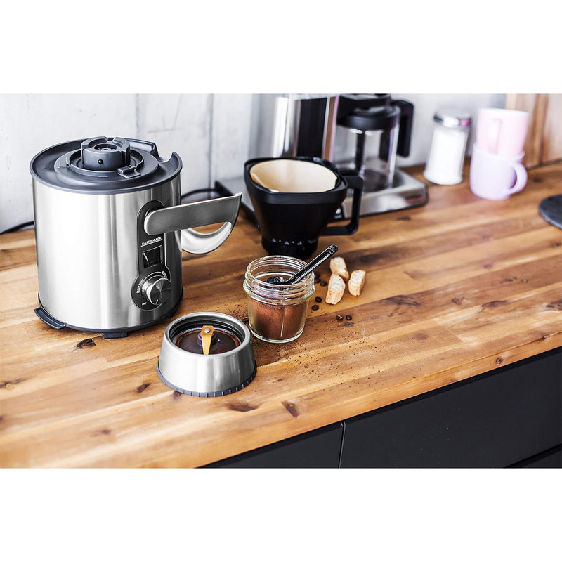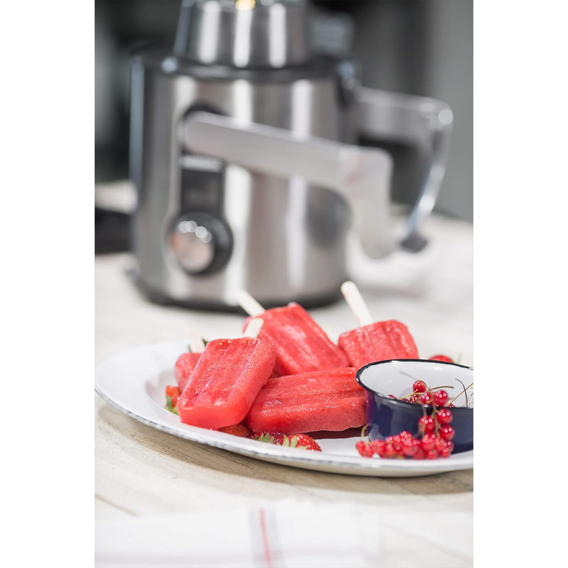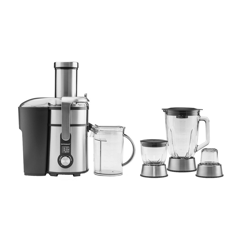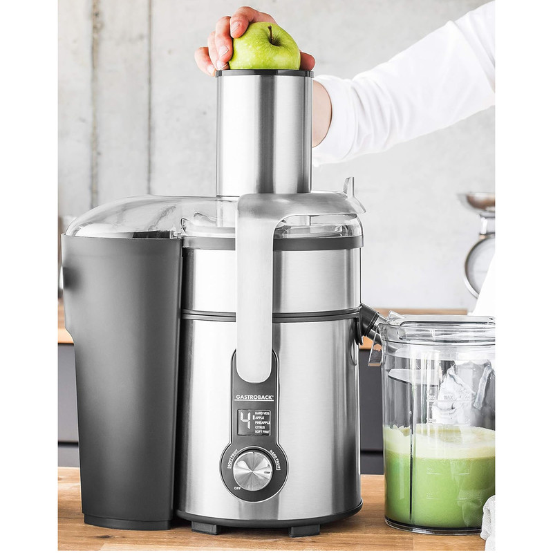 آبمیوه گیری گاستروبک مدل 40152 قابلیت آبگیری و مخلوط کردن انواع میوه و سبزیجات بدون از دست دادن خواص اولیه آنها و همچنین قابلیت آسیاب کردن انواع خشکبار را دارد. بدنهی استيل و طراحی زيبای این دستگاه هم ظاهر جذابی دارد و هم کیفیت بالایی را در خود میبیند. ورودی میوه در آب میوه گیری دیجیتال 4 کاره گاستروبک مدل 40152 از جنس استیل با قطر 84 میلیمتر است که به راحتی میتوان میوهها با ابعاد بزرگتر در داخل آن قرار داد. این آبمیوه گیری چند کاره علاوه بر آبگیری، قابلیت مخلوط کردن انواع میوه و سبزیجات و خرد کردن خشکبار را هم در خود میبیند. آب ميوه گير مدل 40152 شرکت گاستروبک، سرعتی معادل 13000 دور در دقیقه دارد و موتور حرفهای آن با طول عمر بالا با قدرت 1300 واتی، آن را در بین دستگاههای بالا رده و با کیفیت قرار میدهد. بدنه فلزی و بسیار محکم این دستگاه ظاهری زیبا و منحصر بفرد به آن بخشیده است و علاوه بر این تمیز کردن آن هم روند ساده و آسانی دارد. آب میوه گیری دیجیتال 4 کاره مدل 40152 گاستروبک دارای یک پارچ مدرج و مناسب برای نگهداری در یخچال و فریزر بوده و مخزن تفاله گیر دستگاه هم در قسمت پشت دستگاه تعبیه شده است.