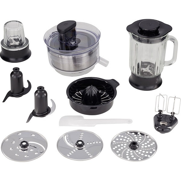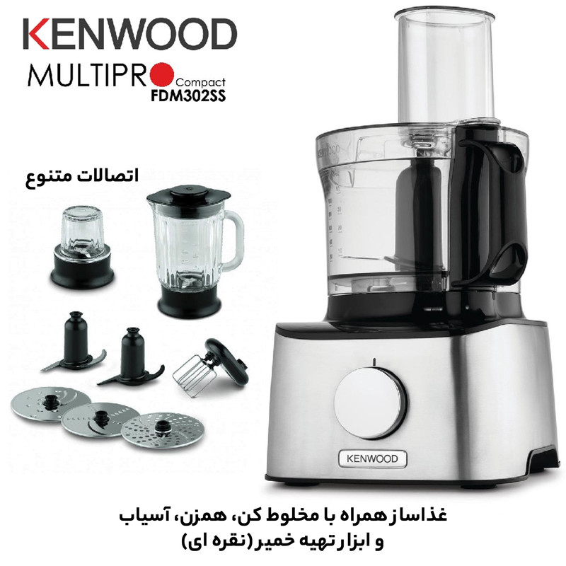 غذاساز کنوود FDM307SS؛ موتور ۸۰۰ وات قدرتمند، کاسه ۲.۱ لیتری و پارچ شیشهای ۱.۲ لیتری، دو سرعت + پالس، انواع دیسک، آسیاب، قلاب خمیر و ابزارهای چندکاره.