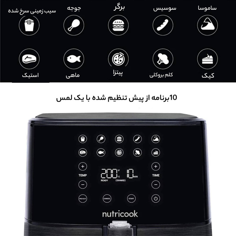 سرخکن نوتریکوک AF205؛ ظرفیت ۵.۵ لیتر، توان ۱۷۰۰ وات، ۱۰ برنامه لمسی، فناوری SmartTemp با پیشگرمایش، پخت کمروغن و تمیزکاری آسان.