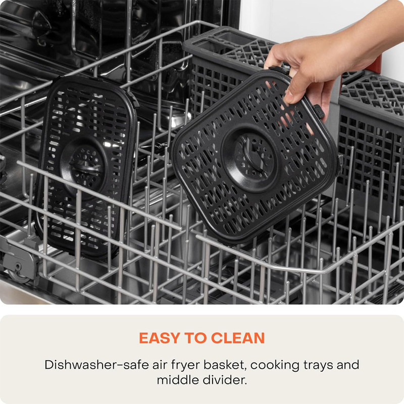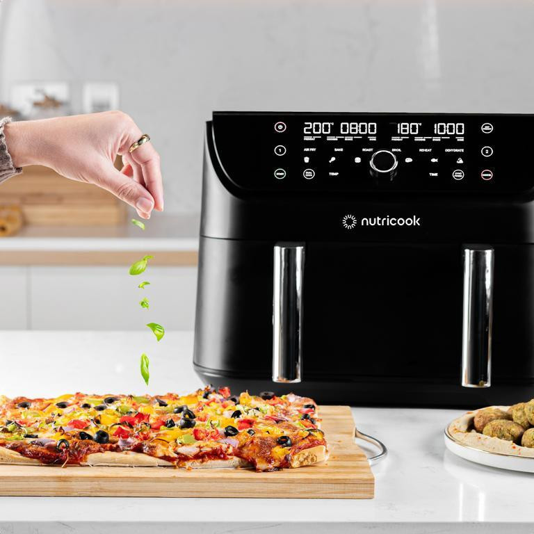 سرخکن Nutricook Duo 2 مدل AFD285 ترکیبی از ظرفیت بالا، عملکرد هوشمند و تنوع پخت است. ساختار FlexZone امکان استفاده همزمان دو منطقه پخت یا تبدیل به یک سبد بزرگ را فراهم میکند. توان ۲۴۰۰ وات گرمایش سریع و یکنواخت از ۳۵ تا ۲۰۰ درجه برای پختهای متنوع مانند سرخکردن، کباب کردن، پخت، بازگرمکردن و خشککردن را تضمین میکند. با ۱۲ برنامه از پیشتنظیم شامل سیبزمینی، مرغ، برگر، استیک، ماهی و سمبوسه، کافیست گزینه مورد نظر را انتخاب کرده و منتظر نتیجه باشید. قابلیت پیشگرمایش خودکار (Pre‑heat) و یادآوری نیاز به تکان دادن مواد (Shake Reminder)، کنترل تجربه پخت را آسان میکند. نمایشگر لمسی و ولوم تنظیم زمان/دما کاربری را ساده کردهاند و پنل این دستگاه شامل وضعیت پخت، زمان باقیمانده و دمای جاری است. قطعات نچسب و قابل جداشدن باعث تمیزکردن سریع و آسان میشوند. ابعاد ۴۰×۳۹×۳۲ سانتیمتر، وزن حدود ۸.۱ کیلوگرم و گنجایش ۸.۵ لیتر آن را گزینهای مناسب برای خانواده تا ۸ نفر میسازد.