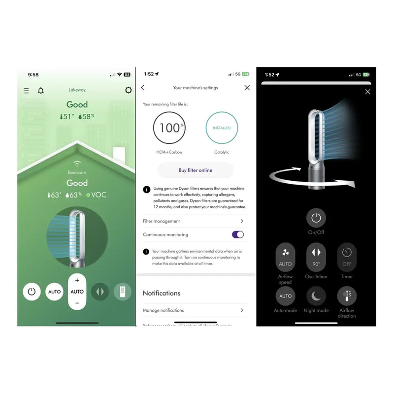 | سایر توضیحات | تصفیه و خنککنندگی: با استفاده از فناوری Air Multiplier™، هوای تصفیهشده را بهطور یکنواخت در سراسر اتاق پخش میکند و در صورت نیاز، بهعنوان پنکه عمل میکند./ حالت پخش معکوس (Diffused mode): امکان تصفیه هوا بدون ایجاد جریان مستقیم هوا، مناسب برای فصول سرد یا هنگام خواب / عملکرد بیصدا: مهندسی صوتی برای کاهش نویز، ۲۰٪ بیصداتر از مدلهای قبلی / نگهداری آسان: فیلتر HEPA+کربن فعال هر ۱۲ ماه یکبار نیاز به تعویض دارد؛ فیلتر کاتالیزوری نیاز به تعویض ندارد / نمایشگر کیفیت هوا:با نمایش PM2.5، PM10، VOC، NO₂، دما و رطوبت / گواهیهای آلرژی:دارای تأییدیه از مؤسسات معتبر مانند Asthma & Allergy Foundation / دستگاه تصفیه هوای Dyson Purifier Cool Formaldehyde TP09 Dyson Purifier Cool Formaldehyde TP09 با بهرهگیری از فناوری Air Multiplier™، هوای تصفیهشده را با حجم بالا در محیط پخش میکند. بر اساس اطلاعات رسمی، این دستگاه قادر است تا ۷۷ گالن در ثانیه (معادل حدود ۲۹۰ لیتر در ثانیه) هوا را به گردش درآورد. برای درک بهتر، این میزان جریان هوا معادل حدود ۶۱۸ فوت مکعب در دقیقه (CFM) است. این توانایی باعث میشود که TP09 بهطور مؤثری هوای اتاقهای بزرگ را تصفیه و خنک کند./ همچنین، در حالت پخش معکوس (Diffused Mode)، جریان هوا از پشت دستگاه خارج میشود که برای تصفیه هوا بدون ایجاد جریان مستقیم مناسب است. در این حالت، حجم هوادهی کاهش مییابد، اما همچنان عملکرد تصفیه هوا حفظ میشود.این ویژگیها، همراه با فیلترهای HEPA H13 و کربن فعال، TP09 را به گزینهای ایدهآل برای افرادی تبدیل میکند که به کیفیت هوای محیط زندگی خود اهمیت میدهند. / در دستگاه تصفیه هوای Dyson Purifier Cool Formaldehyde TP09، تنظیمات خودکار (Auto Mode) به گونهای طراحی شدهاند که دستگاه بهصورت هوشمند و خودتنظیم، کیفیت هوا را در سطح بهینه حفظ کند.تشخیص کیفیت هوا در زمان واقعی:دستگاه با استفاده از حسگرهای پیشرفته داخلی، بهطور مداوم کیفیت هوا را پایش میکند. این حسگرها شامل:PM2.5 (ذرات معلق ریز) PM10 (ذرات بزرگتر) VOC (ترکیبات آلی فرّار مانند بو و بخارات مواد شیمیایی) NO₂ (دیاکسید نیتروژن) دما و رطوبت و بهصورت خاص، فرمالدهید / تحلیل و تصمیمگیری خودکار:دستگاه دادههای سنسورها را تجزیهوتحلیل میکند و در صورت شناسایی آلودگی، بهصورت خودکار فن را در سرعت مناسب تنظیم میکند تا هوا را تصفیه کند. اگر کیفیت هوا مناسب باشد، سرعت فن را کاهش داده یا دستگاه را در حالت آمادهبهکار نگه میدارد تا مصرف انرژی نیز بهینه شود./نمایش اطلاعات بر روی نمایشگر:نمایشگر دستگاه، سطح کیفیت هوا را بهصورت نموداری و عددی نمایش میدهد. همچنین میتوانید وضعیت سنسورها را در اپلیکیشن MyDyson مشاهده کنید. |
