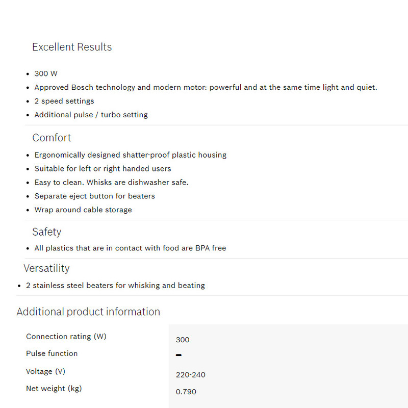 همزن دستی بوش MFQ3010؛ همراهی کوچک و حرفهای با موتور ۳۰۰ وات، ۵ سرعت + توربو و میله استیل؛ برای آشپزی دقیق و بیدردسر در لحظههای خلاقانه.