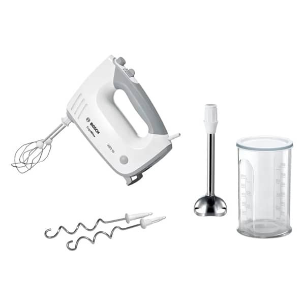 همزن دستی بوش MFQ36470؛ موتور 450 وات، دو سرعت + توربو، دو میله و دو حلقه همزن استیل—ابزاری کامل برای ترکیب بیعیب مواد در لحظههای شیرینیپزی.
