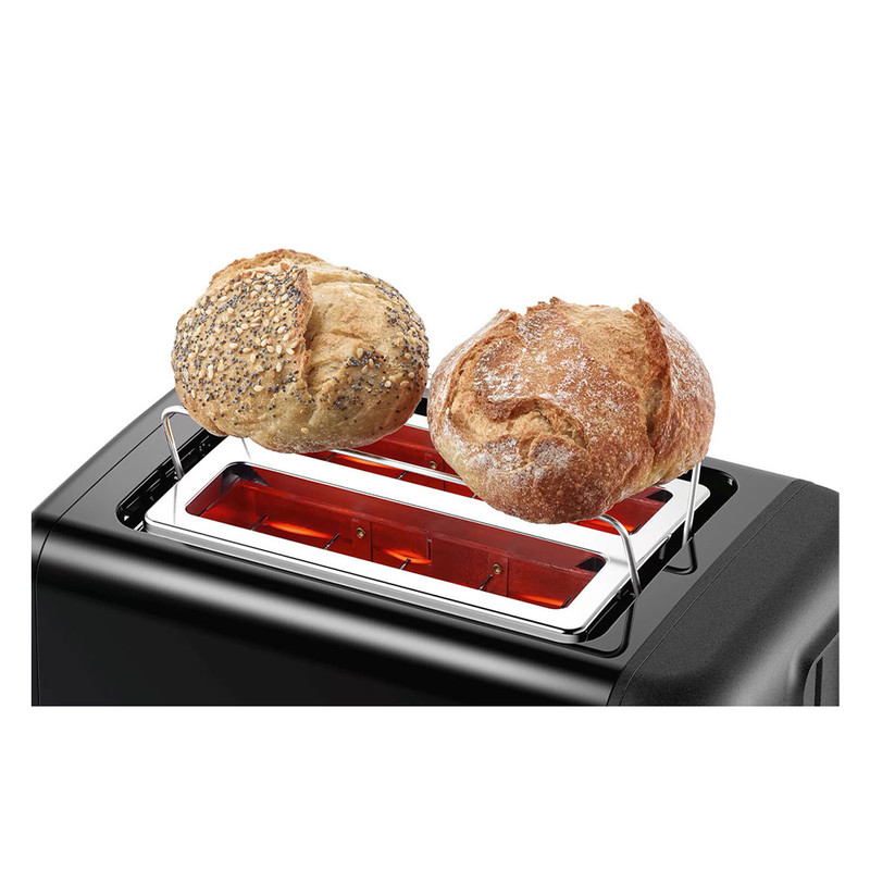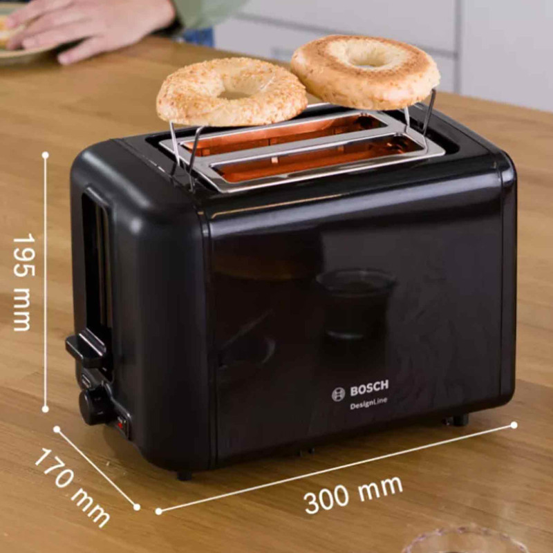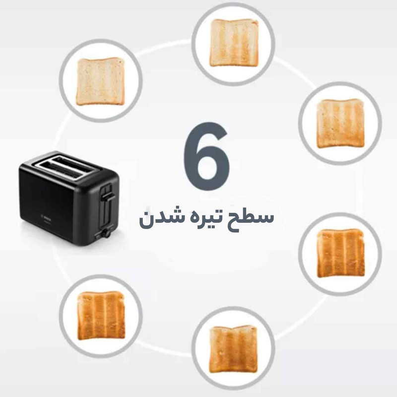 توستر بوش BOSCH مدل TAT3P423 با حداکثر توان 970 وات ، دارای بدنه ای از جنس پلاستیک مقاوم و به صورت عایق حرارت میباشد. در این دستگاه دو جایگاه برای قرار گیری نان تعبیه شده است . توسط توستر بوش میتوان نان های درون منزل را به صورت تازه و برشته میل نمایید. توستر 3P423 بر روی پنل خود دارای یک ولوم چرخشی برای تنظیم حرارت در 6 درجه و کلید های یخ زدایی و توقف عملیات میباشد. توسط عملکرد یخ زدایی میتوانید نان ها را به محض خروج از فریزر درون دستگاه قرار دهید و پس از یخ زدایی ، توسط درجه حرارت دلخواه ، برشته نمایید . قطعه فلزی مخصوصی که در بین دو جایگاه نان قرار دارد برای گرم نمودن نان های گرد و بزرگ و گرم نمودن مجدد نان استفاده میشود. این دستگاه دارای سیستم ایمنی میباشد و در صورت چسبیدن نان به داخل دستگاه ، توستر به صورت خودکار خاموش میشود و مانع از سوختن نان میشود. یک سینی مخصوص قرار گیری خرده نان در زیر دستگاه تعبیه شده است.
