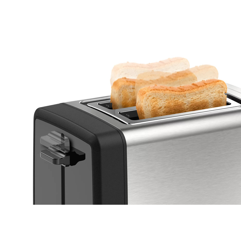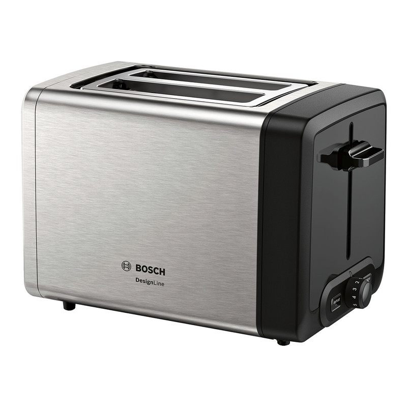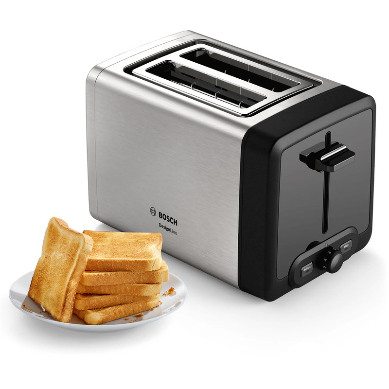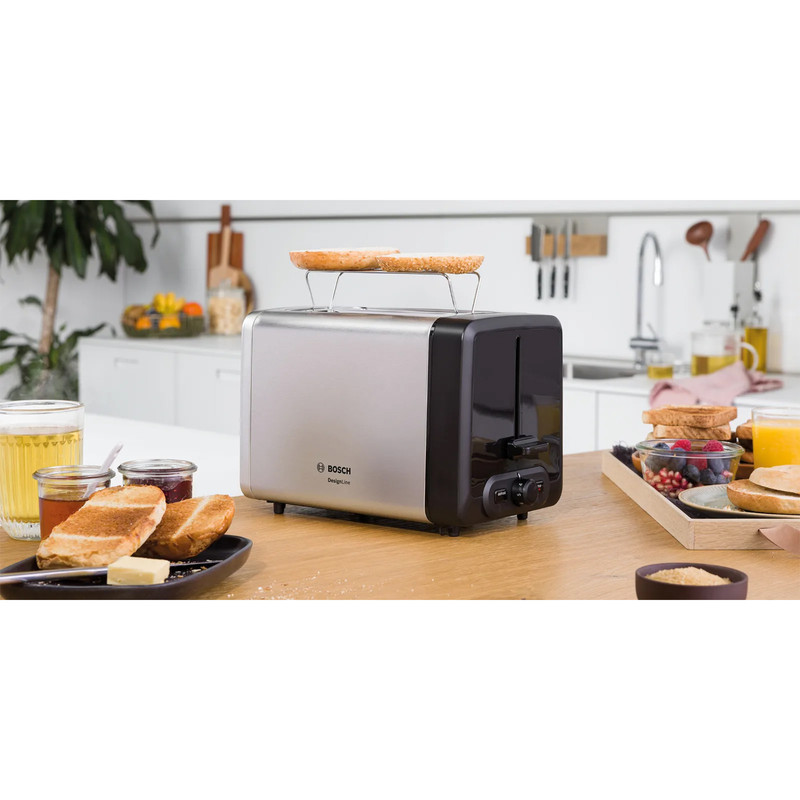 توستر بوش BOSCH مدل TAT4P420 با توان 970 وات و ظاهری بسیار شکیل ، جلوه زیبایی به آشپزخانه شما میبخشد. توسط توستر بوش میتوانید نان های داخل یخچال را به صورت تازه و برشته میل نمایید که این ویژگی از اصراف نان جلوگیری میکند. توستر TAT4P420 دارای سیستم گرمایش flat heating element بوده که موجب توزیع گرما در تمام نقاط نان به صورت یکسان میشود. هنگامی که از توستر های عادی چندین بار پیاپی استفاده میشود ، دمای داخل دستگاه بالا میرود و نان های سری بعدی نسبت به نان های سری اول ، برشته تر میشوند. برای توست شدن تمام نان ها با یک دما و میزان برشتگی در توستر TAT4P420 از ویژگی Auto heat استفاده میشود. توستر بوش بر روی پنل خود دارای کلید های تنظیم حرارت در 6 مرحله ، کلید یخ زدایی و توقف عملیات میباشد. از قطعه فلزی مخصوصی که در بین دو جایگاه نان قرار دارد برای گرم نمودن نان های گرد و بزرگ و گرم کردن مجدد نان استفاده میشود. یک سینی مخصوص خرده نان در زیر دستگاه تعبیه شده است.