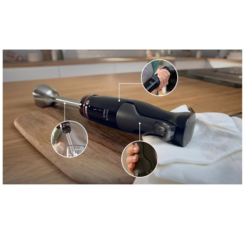 گوشتکوب برقی بوش مدل MSM4B670GB دستگاهی قدرتمند، کاربردی و چندکاره است که با توان بالای ۱۰۰۰ وات، برای آمادهسازی انواع غذاها و مواد اولیه، انتخابی حرفهای به شمار میرود. این دستگاه به موتور قدرتمند و کمصدا مجهز شده و با طراحی ارگونومیک، خوشدست و سبک، کار با آن را راحت و لذتبخش میسازد. تیغه چهارپرهای از جنس استیل ضدزنگ با فناوری QuattroBlade، خرد و مخلوط کردن مواد سخت را با دقت و سرعت بالا انجام میدهد. امکان تنظیم سرعت متغیر همراه با دکمه Turbo، کنترل دقیق بر فرآیند آمادهسازی را در اختیار شما میگذارد. این مدل با کاسه غذاساز ۱.۲۵ لیتری برای خرد کردن، رنده کردن و ورقهای کردن مواد غذایی عرضه میشود. همچنین دارای لیوان مدرج ۶۰۰ میلیلیتری، همزن بالونی برای تهیه خامه یا تخممرغ و خردکن کوچک برای سیر، پیاز و آجیل است. پایه گوشتکوب نیز دارای طراحی ضدپاشش بوده و تمام قطعات (بهجز موتور) قابل شستوشو در ماشین ظرفشویی هستند. با طراحی مدرن و ترکیب رنگ مشکی و خاکستری، MSM4B670GB هم از نظر عملکرد و هم زیبایی، گزینهای ممتاز برای آشپزخانه شماست.