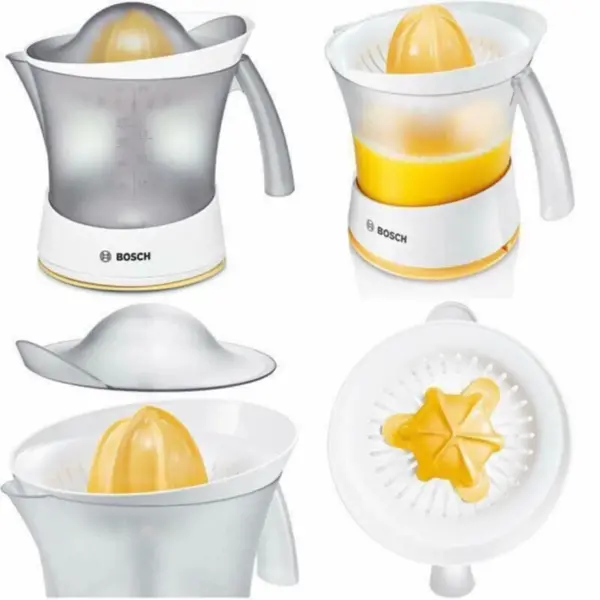 آب مرکبات گیری بوش مدل MCP3500 از محصولات کوچک و کاربردی و همچنین پرفروش موجود در بازار است که کیفیت بالایی دارد. این محصول امکان آبگیری تعداد زیادی پرتقال یا لیمو یا سایر مرکبات را دارد، چرا که ظرفیت حجم آن کمی کمتر از 1 لیتر است. آب مرکبات گیری بوش مدل MCP3500 بدنهی پلاستیکی و با کیفیتی دارد که هم زیبا طراحی شده و ترکیب رنگهای روشن سفید و زرد جذابیتی خاصی به آن بخشیده است. امکان تهیهی آبمیوه با میزان پالپ مختلف توسط صافیهای این دستگاه وجود دارد. نحوهی قرارگیری مخزن و پایه در این دستگاه طوری طراحی شده است تا به درستی و به راحتی بتوان از آنها استفاده کرد. دسته ظرف این محصول هم طراحی ارگونومیکی داشته و کار با آن را راحتتر میکند. در لبه پایینی این دستگاه شیاری قرار دارد تا کابل برق در آن جای گیرد. یک درپوش برای مواقعی که از دستگاه استفاده نمیشود در بستهبندی دستگاه وجود دارد تا روی مخروط و صافی قرار گیرد.