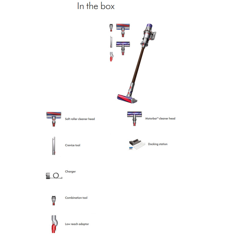 | سایر اقلام همراه محصول | - سری Soft roller cleaner head (برای جاروکشی های روزانه)- سری Motorbar cleaner head (دارای پرز های بلند برای جمع آوری مو و مخصوص فرش های پرز بلند)- سری Crevice tool- سری Combination tool- مبدل Low reach adaptor (برای دسترسی به مکان های دور از دسترس همچون زیر میز و بالای کابینت و لوستر)- پایه اتصال به دیوار- شارژر |