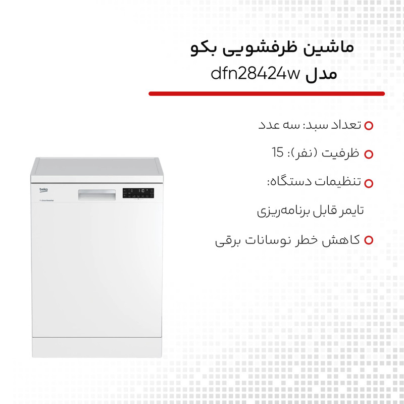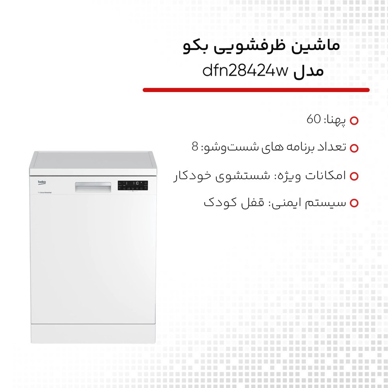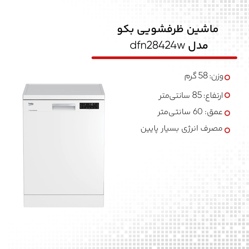 ماشین ظرفشویی بکو 28424 دارای رنگ سفید و طراحی منحصر به فرد است. بکو ماشین ظرفشویی DFN28424 W را با علاوه بر طراحی زیبا بلکه با کاربری و کارایی فوق العاده ای در اختیار کاربران قرار داده است. در این ماشین ظرفشویی ظرفیت 15 نفره است و می توان ظرف هایی که به طور معمول تعداد 15 نفر استفاده می کنند را با آن شستشو داد. موتور این ماشین ظرفشویی بکو از نوع گیربکسی پرو اسمارت است که میزان صدای کم و سنسور های مختلف از ویژگی بارز آن است. تعداد برنامه های آن 8 عدد بوده و می تواند برای هر نوع ظروفی مورد استفاده قرار گیرد. رده انرژی مصرف آن A++ بوده و کارایی شستشوی آن دارای گرید A می باشد. در آن میزان صدا 43 دسیبل است که نشان می دهد این دستگاه می تواند شب موقع خواب هم ظرف ها را بدون سر وصدا شستشو دهد. داخل آن از استیل ضد زنگ ساخته شده و تعداد سبد ها و یا طبقه های آن 3 عدد می باشد. یکی از ویژگی های بارز در این ماشین ظرفشویی، ناحیه پر فشار می باشد که برای شستشوی قابلمه و یا ظروف بسیار کثیف به کار برده می شود.میتوانید این محصول را از فروشگاه اینترنتی گالریا تهیه کنید