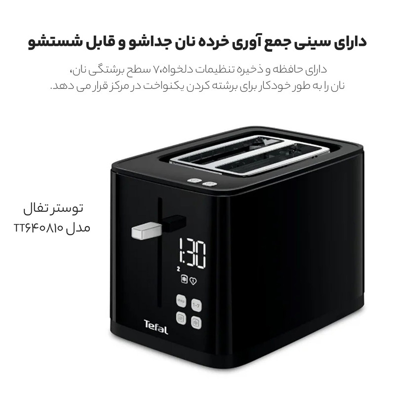 توستر TEFAL مدل TT640810 محصولی ساده و با کیفیت از شرکت معتبر تفال است . توستر با 7 سطح دما و تنظیمات دلخواه برای نان تست می باشد. نمایشگر دیجیتال با شمارش معکوس دیجیتال که نشان می دهد دقیقاً چه مدت مراحل تست طول خواهد کشید. این توستر دارای 3 عملکرد با فشار دادن یک دکمه می باشد که شامل عملکرد متوقف کردن ، یخ زدایی و گرم کردن با چراغ نشانگر که می توانید بلافاصله فرآیند تست را متوقف کنید ، نان منجمد را تست کنید و نان تست شده را در مدت 30 ثانیه گرم کنید. بدنهی دستگاه حین فعالیت خیلی داغ نمیشود و ایمن است . توستر تفال مدل TT640810 سینی جمعآوری خردهنان هم دارد تا چنانچه خردههای نان وارد دستگاه شدند ، امکان بیرونآوردن آنها میسر باشد. این امر کمک میکند در استفادههای بعدی این خردههای نان نسوزند و دود نکنند؛ بهاینترتیب همیشه نان تستشدهی خوشمزه و دلخواهتان آماده خواهد بود . مزایای دیگر این توستر تنظیمات دلخواه خود را ذخیره کنید تا در آینده فقط یک کلیک با نان تست دلخواه خود فاصله داشته باشید. علاوه بر نمایشگر دیجیتال یکپارچه ، که شمارش معکوس از زمان تست را نشان می دهد ، هفت سطح مختلف دمایی ، از کمی طلایی تا فوق العاده ترد را ارائه می دهد.