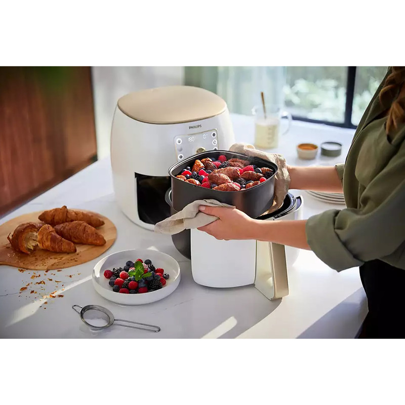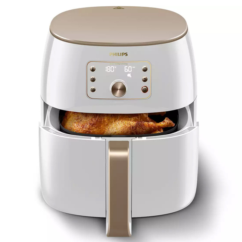 سرخ کن بدون روغن مدل HD9870/20 محصولی زیبا و با کیفیت از کمپانی نام آشنای فیلیپس می باشد این محصول دارای فناوری سنجش هوشمند بوده که به طور خودکار زمان و دما را تنظیم می کند تا نتایج بی دردسری به شما ارائه دهد فناوری Philips Rapid Air در سرخ کن مدل HD9870/20 فیلیپس سرعت جریان هوا در سبد را 7 برابر در مقایسه با سرعت جریان هوا در Airfryer Philips Viva با کف صاف افزایش می دهد. برنامه های آشپز هوشمند برای غذاهای محبوب فناوری حذف چربی برای نتایج خوشمزه و ترد تنظیمات راحت «گرم نگه دارید» و «غذای مورد علاقه خود را ذخیره کنید». قابلیت QuickClean و قابلیت شستشوی تمامی قطعات جداشدنی در ماشین ظرفشویی 1.4 کیلوگرم، ظرفیت 7.3 لیتر همراه با یک ظرف پخت خانوادگی و 9 قالب کیک ¹Airfryer XXL دارای بالاترین وات، سریعترین زمان گرم شدن و نتایج همگن تر سیب زمینی سرخ شده منجمد است.