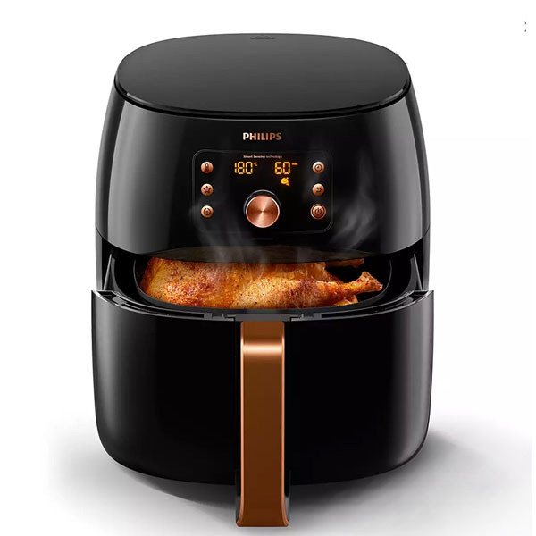 سرخ کن فیلیپس مدل HD9860با فناوری سنجش هوشمند تنها سرخ کن هوای گرم است که از سنسورها برای تنظیم مداوم دما و زمان استفاده می کند و بدین ترتیب نتایج کاملی را برای 5 غذای مختلف (سیب زمینی سرخ شده فرانسوی تازه ، سیب زمینی سرخ شده سرخ شده ، مرغ کامل ، پاهای مرغ ، ماهی کامل). این فناوری همچنین از فناوری ثبت اختراع Rapid Air با فناوری حذف چربی ترکیب می کند. تمام غذاهای مورد علاقه شما را می توان با کمی روغن تهیه کرد و چربی اضافی از مواد غذایی حذف می شود. با استفاده از نمایشگر دیجیتال می توان دما و زمان پخت و پز را به طور دقیق تنظیم کرد و برنامه های Smart Chef یا عملکرد گرم نگه داشتن را انتخاب کرد. عملکرد پخت سیب زمینی، گوشت، مرغ، ماهی،سبزیجات، اسنک، پیتراف دسر و...دارای کانوکشن یا فندارای سیستم قطع خودکارقابلیت تنظیم دما دارای چراغ نشانگر زمان پخت بدنه عایق سردصفحه کنترل لمسی.