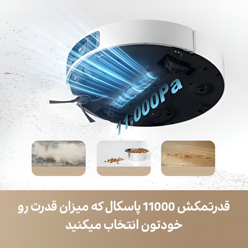 | سایر توضیحات | ابعاد ربات: 103.8×350×350 میلی متر ایستگاه شارژ: 590.5×456.7×340 میلی مترظرفیت مخزن آب : 80 میلی لیترقدرت مکش: 11000 پاسکالعملکردها:مکش گردوغبار، طی کشی خیس و خشک، خود تمیزکنندهنوع موتور:براشلسنوع تی کشی:پد تی چرخشی-خیس و خشکقابلیت ماپ لیفتینگ: 10.5 میلی مترظرفیت مخزن گرد و خاک: 3.2 لیترزمان استفاده با شارژ کامل: 194 دقیقهظرفیت مخزن آب تمیز ایستگاه: 4.5 لیترظرفیت مخزن آب کثیف: 4 لیترتخلیه خودکار زباله:✅شست و شوی خودکار تی ها:✅قابلیت خشک کردن پد تی: ✅میزان شارژدهی باتری: 194 دقیقهظرفیت باتری: 5200 میلی آمپرحسگرها: دوربین هوشمند RGB - حسگر رنگ 5 کانال - و سیستم هوشمند تشخیص کثیفی |