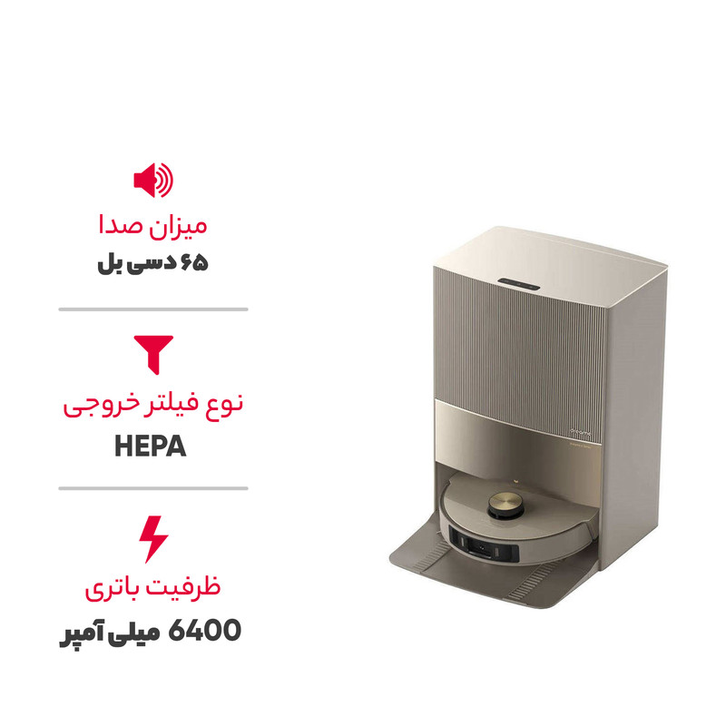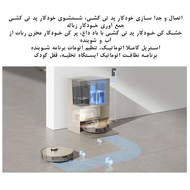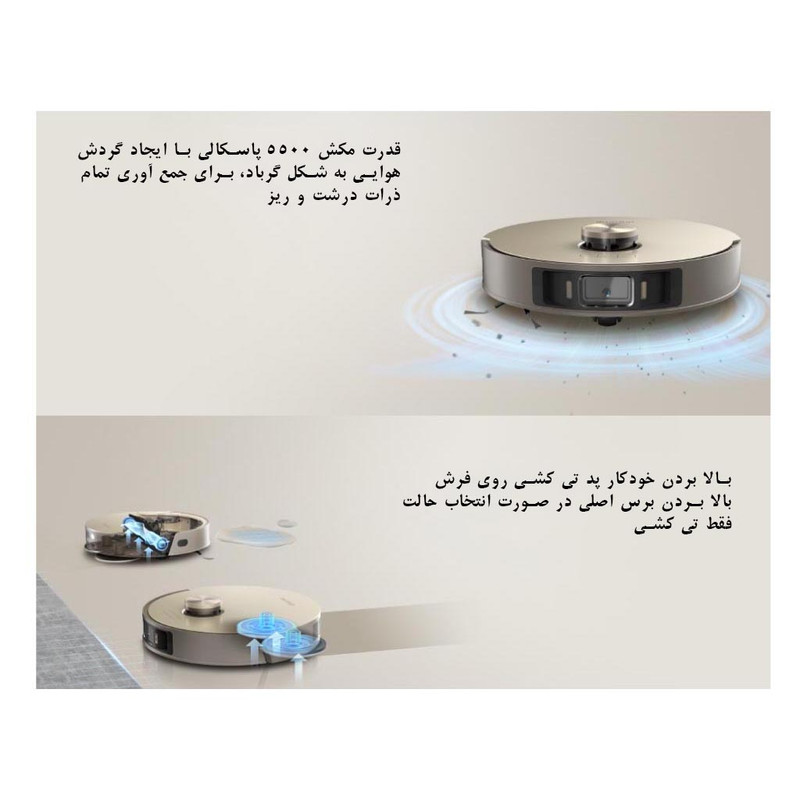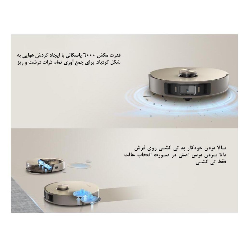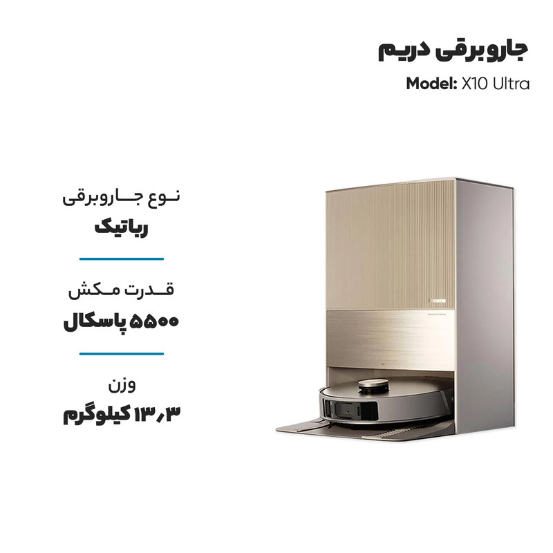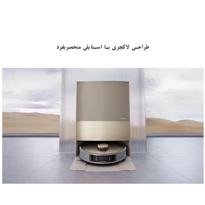 جارو رباتیک Dreame X10 Ultra، پرچمدار لاکچری برند دریم از آخرین جارو رباتیکهای Dreame سری 10 است. این محصول در سال 2023 به بازار عرضه شده است. Dreame X10 Ultra رباتی همه کاره و به معنای واقعی مستقل است. محصولی کامل، بی نقص و به روز که از آخرین امکانات سخت افزاری در آن استفاده شده است. در اولین نگاه قطعا متوجه تفاوت ظاهری این محصول با نسلهای قبل خواهد شد. ظاهر خاص و متفاوت آن با رنگ بدنه بژ مایل به طلایی برنده جایزه بهترین طراحی شده است. از نظر سخت افزاری نیز بهترین ها در این محصول گنحانده شده است. موتور ژاپنی با قدرت مکش 5500 پاسکال به خوبی هر ذره ای را از زمین پاک کرده در عین حال هیچ آسیبی به فرش شما وارد نمیکند. جدیدترین تکنولوژی لیزر LDS در این محصول به راحتی نقشه منزل شما را رسم میکند. مجموعه ای از سنسور و دوربین در جلوی ربات برای تشخیص اجسام روبرو قرار داده شده است که برای منازل شلوغ و محیط با فرزند خردسال و حیوانات خانگی بسیار مناسب است. در جلوی ربات چراغهایی قرار دارد که در نور کم به طور خودکار روشن شده تا در تاریکی مطلق هم بدون ذره ای خطا عمل کند. ظرفیت باتری داخلی محصول 6400 میلی آمپر و با قابلیت FastCharge است که با یکبار شارژ تا 180 دقیقه کار میکند. تی کشی محصول به شکل چرخشی و با اعمال فشار است که تمام لکه ها را هر چقدر قدیمی و مقاوم به خوبی پاک میکند. پدها به صورت خودکار میتواند از ربات جدا و یا به آن وصل شود. ربات دارای قابلیت بالا بردن پد تی کشی در حین رسیدن به فرش و بالا بردن برس غلطان اصلی در حالت فقط تی کشی است تا ذره ای آب وارد موتور نشود. مهمترین مزیت این ربات ایستگاه شارژ و نظافتی آن است. جارو برقی Dreame X10 Ultra پد تی کشی را در ایستگاه شارژ میشوید و با باد داغ خشک میکند. در این ایستگاه شارژ دو مخزن آب تمیز و کثیف 4.5 لیتری وجود دارد.یک مخزن جداگانه برای افزودن مایع شستشوی کف در این ایستگاه قرار دارد. بنابراین در صورت نیاز به نظافت بیشتر میتوانید مایعات شوینده هم اضافه کنید. جارو برقی Dreame X10 Ultra به کمک یون نقره تمام سطوح منزل را استریل میکند و همه اجزا داخلی و سطحی در حین و پس از پایان کار کاملا استریل میشود. زباله های جمع آوری شده توسط ربات هم در یک پاکت آنتی باکتریال 3.2 لیتری جمع میشود که حداقل تا 75 روز نیاز به تعویض ندارد