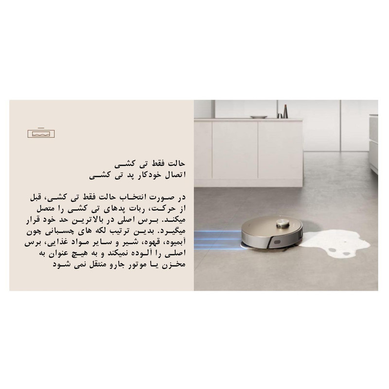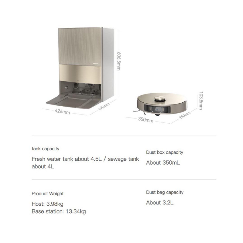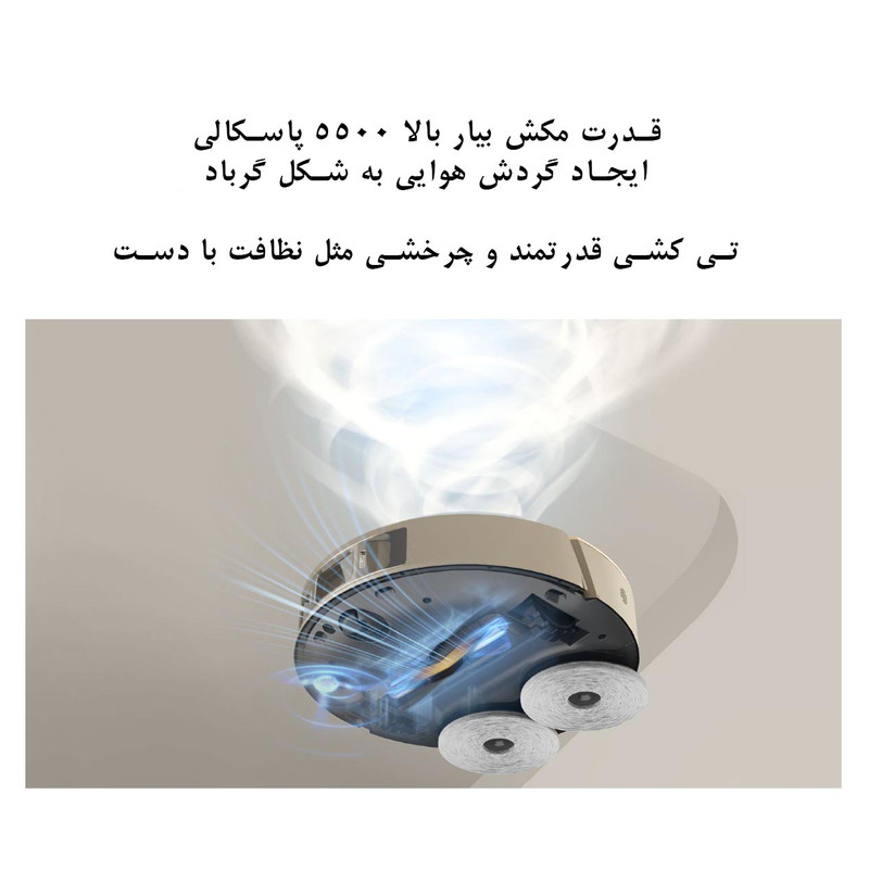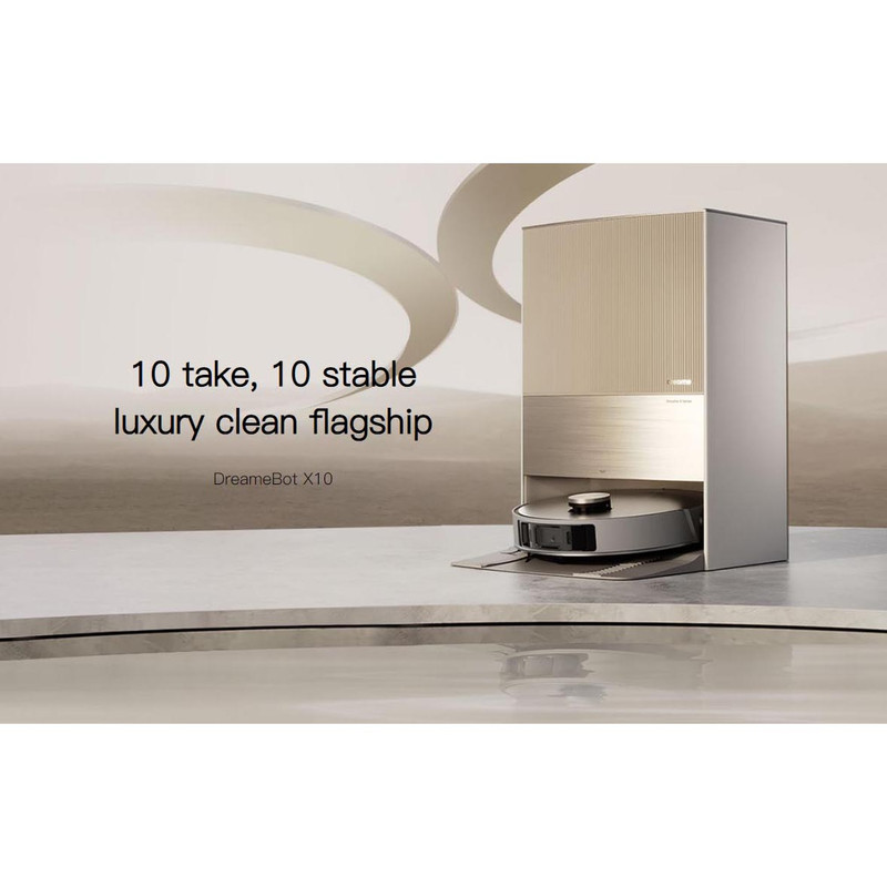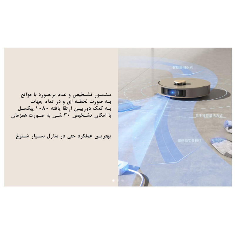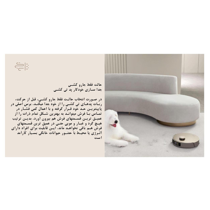 جارو رباتیک Dreame X10 Ultra، پرچمدار لاکچری برند دریم از آخرین جارو رباتیکهای Dreame سری 10 است. این محصول در سال 2023 به بازار عرضه شده است. Dreame X10 Ultra رباتی همه کاره و به معنای واقعی مستقل است. محصولی کامل، بی نقص و به روز که از آخرین امکانات سخت افزاری در آن استفاده شده است. در اولین نگاه قطعا متوجه تفاوت ظاهری این محصول با نسلهای قبل خواهد شد. ظاهر خاص و متفاوت آن با رنگ بدنه بژ مایل به طلایی برنده جایزه بهترین طراحی شده است. از نظر سخت افزاری نیز بهترین ها در این محصول گنحانده شده است. موتور ژاپنی با قدرت مکش 5500 پاسکال به خوبی هر ذره ای را از زمین پاک کرده در عین حال هیچ آسیبی به فرش شما وارد نمیکند. جدیدترین تکنولوژی لیزر LDS در این محصول به راحتی نقشه منزل شما را رسم میکند. مجموعه ای از سنسور و دوربین در جلوی ربات برای تشخیص اجسام روبرو قرار داده شده است که برای منازل شلوغ و محیط با فرزند خردسال و حیوانات خانگی بسیار مناسب است. در جلوی ربات چراغهایی قرار دارد که در نور کم به طور خودکار روشن شده تا در تاریکی مطلق هم بدون ذره ای خطا عمل کند. ظرفیت باتری داخلی محصول 6400 میلی آمپر و با قابلیت FastCharge است که با یکبار شارژ تا 180 دقیقه کار میکند. تی کشی محصول به شکل چرخشی و با اعمال فشار است که تمام لکه ها را هر چقدر قدیمی و مقاوم به خوبی پاک میکند. پدها به صورت خودکار میتواند از ربات جدا و یا به آن وصل شود. ربات دارای قابلیت بالا بردن پد تی کشی در حین رسیدن به فرش و بالا بردن برس غلطان اصلی در حالت فقط تی کشی است تا ذره ای آب وارد موتور نشود. مهمترین مزیت این ربات ایستگاه شارژ و نظافتی آن است. جارو برقی Dreame X10 Ultra پد تی کشی را در ایستگاه شارژ میشوید و با باد داغ خشک میکند. در این ایستگاه شارژ دو مخزن آب تمیز و کثیف 4.5 لیتری وجود دارد.یک مخزن جداگانه برای افزودن مایع شستشوی کف در این ایستگاه قرار دارد. بنابراین در صورت نیاز به نظافت بیشتر میتوانید مایعات شوینده هم اضافه کنید. جارو برقی Dreame X10 Ultra به کمک یون نقره تمام سطوح منزل را استریل میکند و همه اجزا داخلی و سطحی در حین و پس از پایان کار کاملا استریل میشود. زباله های جمع آوری شده توسط ربات هم در یک پاکت آنتی باکتریال 3.2 لیتری جمع میشود که حداقل تا 75 روز نیاز به تعویض ندارد