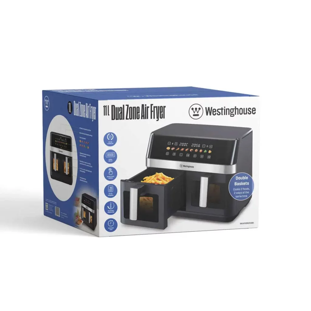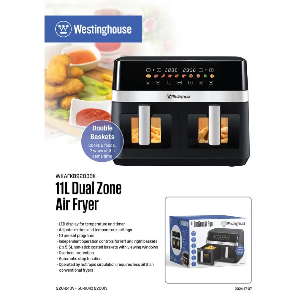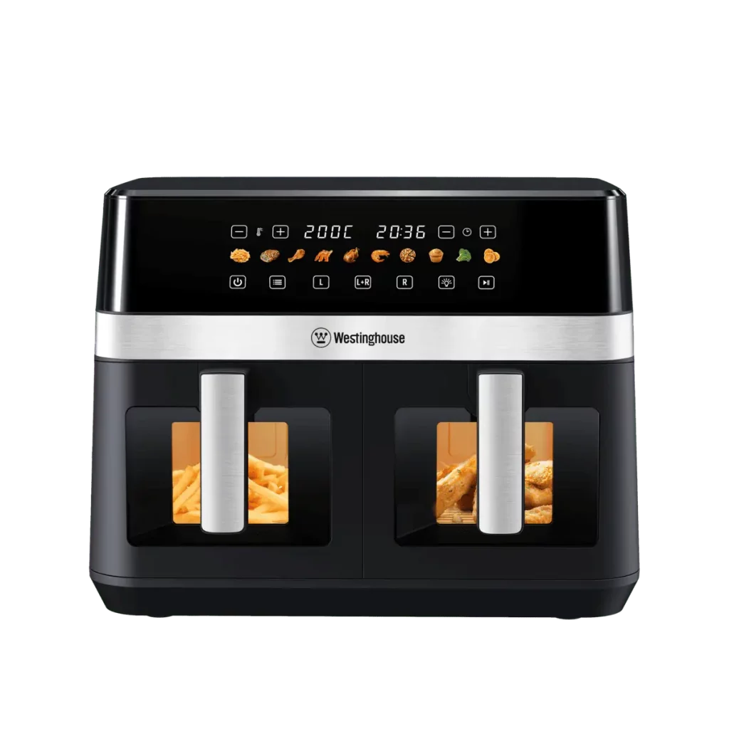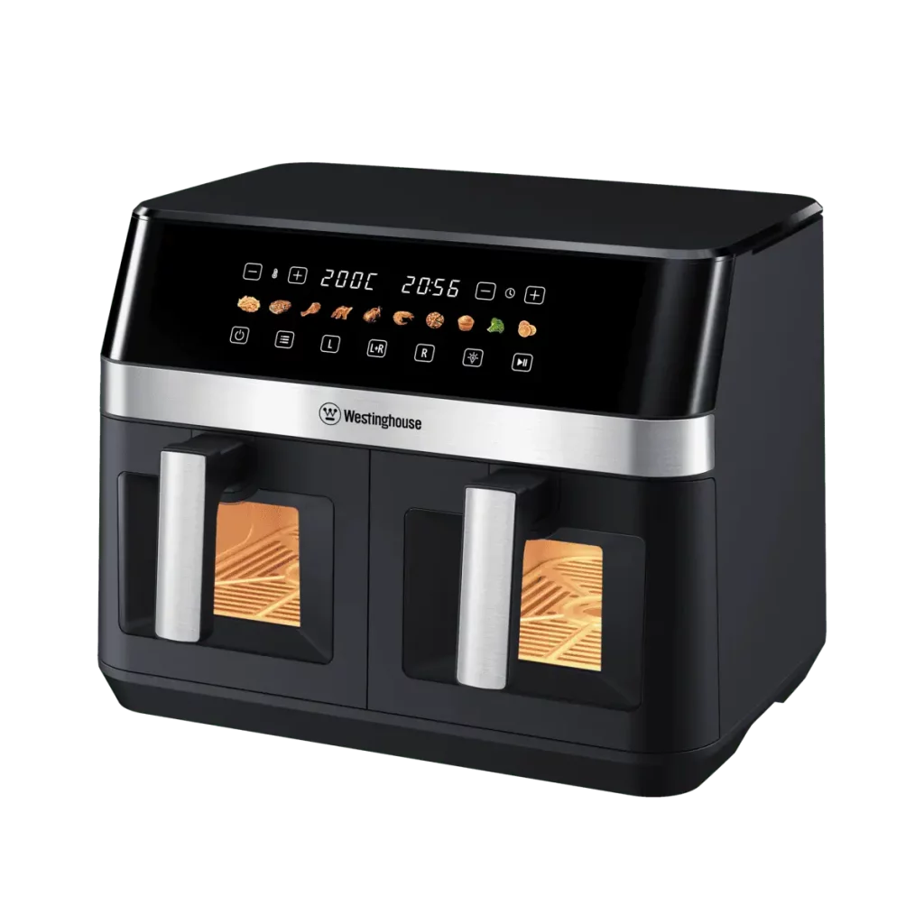 سرخکن دوقلو وستینگهاوس مدل WKAFKB9203BK با طراحی مدرن و عملکرد بدون روغن، گزینهای ایدهآل برای پخت سالم و سریع غذاهای متنوع است ✅ این دستگاه دارای دو محفظه پخت مجزا با ظرفیت کلی 9 لیتر است که امکان تهیه همزمان دو نوع غذا را فراهم میکند ✅ هر سبد بهصورت مستقل دارای پنل تنظیمات دما و زمان است که کنترل دقیق و همزمان هر بخش را امکانپذیر میسازد ✅ تکنولوژی چرخش هوای گرم 360 درجه در این مدل باعث پخت یکنواخت مواد غذایی با بافتی ترد و طلایی میشود، بدون نیاز به روغن یا با حداقل مصرف آن ✅ دارای صفحهنمایش لمسی LED با رابط کاربری ساده، 12 برنامه پخت پیشفرض برای غذاهایی مانند مرغ، سیبزمینی، ماهی، استیک و دسر میباشد ✅ همچنین عملکرد SYNC Finish و Dual Cook امکان هماهنگسازی زمان پایان پخت دو محفظه یا کپیکردن تنظیمات از یک سبد به سبد دیگر را فراهم میکند ✅ سبدها دارای روکش نچسب و قابل شستوشو در ماشین ظرفشویی هستند ✅ این دستگاه علاوه بر کارایی بالا، ظاهری زیبا و جمعوجور دارد که برای آشپزخانههای مدرن بسیار مناسب است ✅