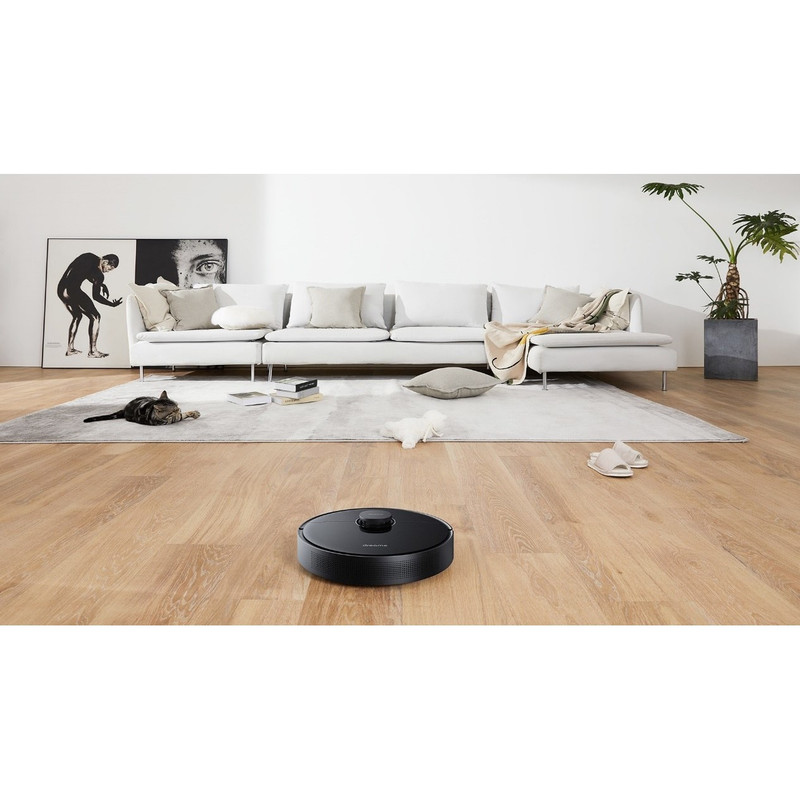 جاروبرقی هوشمند دریم مدل L10 Pro دارای ظاهری شبیه به دیگر جاروبرقیهای رباتیک است. این دستگاه دارای بدنه پلاستیکی مشکی است که سطح براق آن حسابی میدرخشد اما مابقی قسمتهای آن مات است. در قسمت بالای دستگاه فاصلهیاب لیزری تعبیه شده و بخشی از همین سطح به شکل یک درب لولا است که قسمت دسترسی به سطل زباله را ایجاد میکند. در طرف دیگر آن یک کنترل پنل با سه دکمه برای شروع دستی تمیز کردن عمومی، محلی و همچنین بازگشت به پایه وجود دارد. اگر دستگاه را برگردانید، یک غلتک پلاستیکی با موهای مشکی هویدا میشود که توسط یک قاب محافظ پلاستیکی دیگر نگه داشته میشود و در صورت لزوم میتوان آن را برای تمیز کردن یا تعویض سریع و آسان جدا کرد. برس توسط چرخهای محرک قدرتمند با اجهای تراکتوری احاطه شده است. چرخ دیگری نزدیک به لبه محفظه وجود دارد که میتواند 360 درجه بچرخد. در کنارههای این چرخ، شارژ بزرگی دیده میشود که برای اتصال جاروبرقی به ایستگاه برق است. همچنین یک برس زاویه دار سه تیغه در قسمت کنار جاروبرقی قرار دارد. در طرف و مقابل قسمت پایین، کیس، کل بخش دایره برای نصب ماژول تمیز کردن مرطوب نیز مشخص شده است. این جاروبرقی مجهز به سه سنسور ناوبری است و در قسمتهای جانبی آن سوراخهایی برای انتشار هوا تعبیه شده است. قسمت اتصال این مدل ساده و بدون هیچگونه کنترلی است و سطح پایینی آن با یک پد لاستیکی برجسته پوشانده شده که به خوبی از لغزش دستگاه روی یک کف صاف یا محکم جلوگیری کند. نکتهای که در مورد سطل زباله آن وجود دارد آن است که کوچک طراحی شده و از پلاستیک نیمه شاف با فیلتر قابل تعویض HEPA ساخته شده است. این قسمت به راحتی جدا میشود اما محفظه کاملاً محکم است تا زمانی که شما قصد جدا کردن آن را نداشته باشید در جای خود محکم میماند. نکته دیگری که باید به آن توجه کرد، ماژول تمیز کردن مرطوب است. این قسمت دارای یک چرخ کوچک و یک پلت فرم Velcro برای چسباندن موپ است. این قسمت همچنین به عنوان یک ظرف برای آب عمل میکند و درپوش آن توسط یک پلاستیک بسیار محکم بسته میشود. مخزن این قسمت 270 میلیلیتر است. البته این قسمت تنها همانند کشیدن دستمال مرطوب روی زمین است.