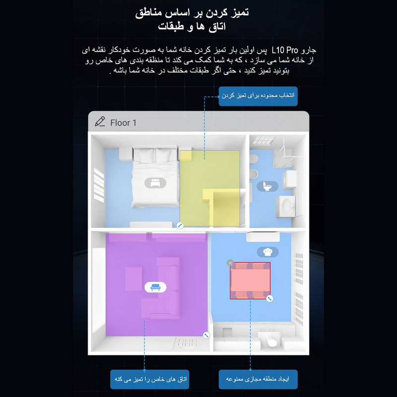 یکی از ویژگیهای بسیار قابل توجه جاروبرقی هوشمند دریم مدل L10 Pro مکانیابی دقیق این ربات است که دادهها را در اختیار کاربران میگذارد. این دستگاه تمام نقشهای کشیده شده برای آن را با سرعت بالایی شناسایی میکند. کاربران میتوانند دو سطح نقشه را ذخیره کنند؛ بنابراین این ربات در خانههای چند سطحی قابل استفاده است. در هر نقشه میتوان مناطق را تقسیم کرد، اتاقها را نامگذاری و مناطق ممنوع را مشخص کنید.