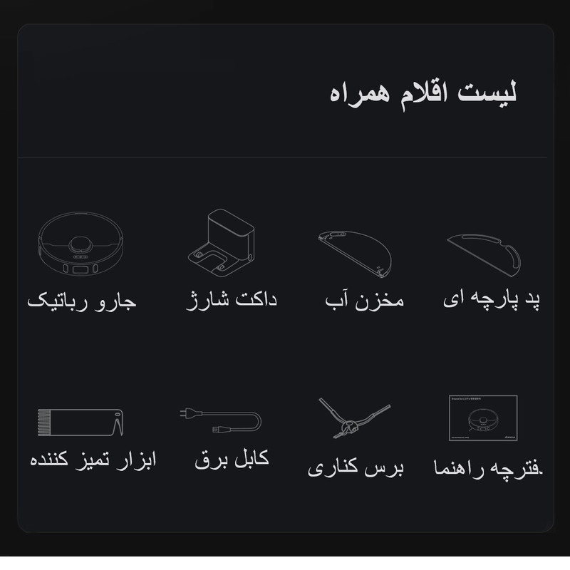 | سایر اقلام همراه محصول | 1 عدد جاروبرقی Dreame Bot L10 Pro1 عدد پایه شارژ1 عدد ابزار تمیز کردن1 عدد کابل برق1 عدد مخزن آب1 عدد پد پارچه ای1 عدد برس جانبی1 x راهنمای کاربر |