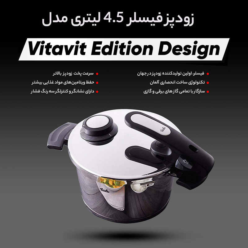 زودپز فیسلر مدل Vitavit Edition Design با گنجایش 4.5 لیتر، پخت سریع و ایمن را با حفظ طعم و مواد مغذی فراهم میکند. این زودپز با طراحی مدرن و کاربرپسند، امکان پخت انواع غذاها را در کمترین زمان ممکن ارائه میدهد. مجهز به سیستم ایمنی پیشرفته و قابلیت تنظیم فشار برای پخت دقیقتر، این مدل برای کسانی که به دنبال کیفیت و راحتی در آشپزی هستند، گزینهای عالی است. این زودپز مناسب خانوادههای کوچک و آشپزی روزانه بوده و به راحتی قابل استفاده و نگهداری است.
