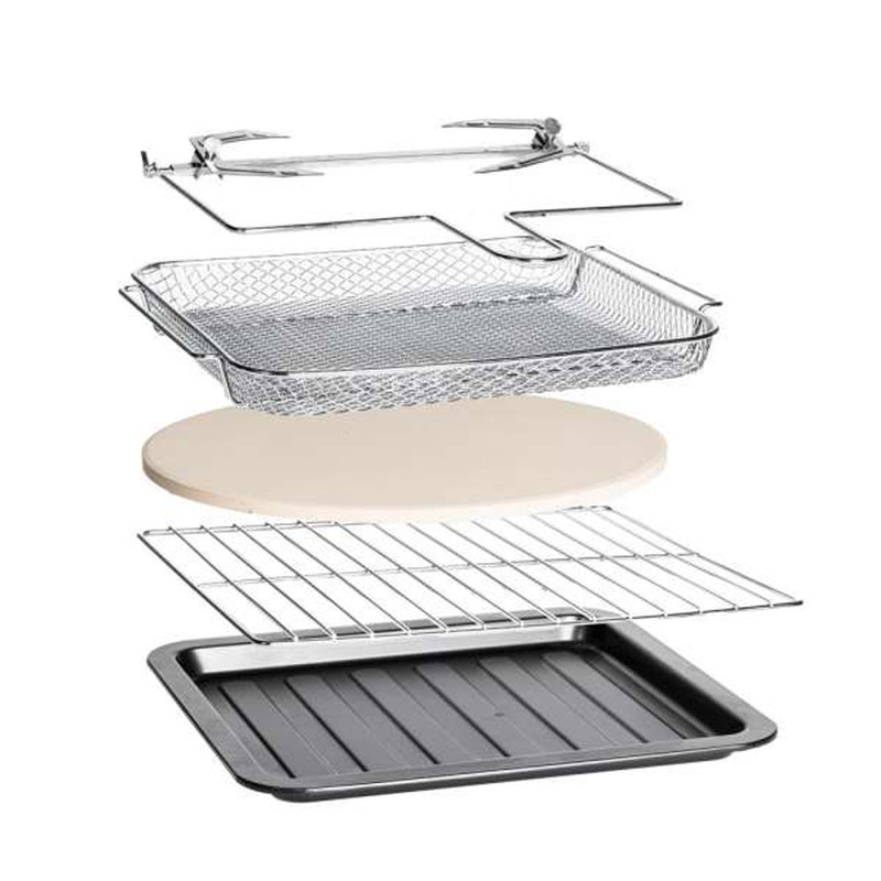 | سایر توضیحات | ظرفیت 22 لیتر در سه قفسه دارای فن گردشی با 2 سطح قدرت برای استفاده به عنوان سرخ کن یا فردارای 6 المنت حرارتی فولاد ضد زنگ (4 المنت در بالا و 2 المنت در پایین، قابل کنترل جداگانه) زمان گرم شدن سریع و توزیع یکنواخت گرما را تضمین می کند.دارای صفحه نمایش لمسی حسگر روشن - برنامه، عملکرد، زمان پخت و دما را نشان می دهددارای قفل کودک با کنترل الکترونیکیآماده سازی سریع پیتزا در حدود. 8.30 دقیقهجمع و جور: در هر آشپزخانه، دفتر کار، کمپینگ و ..... مناسب استدارای 4 برنامه: برشته کردن، یخ زدایی، پخت پیتزا و سیب زمینی سرخ کردهقابل تنظیم دما از 55 تا 220 درجه سانتی گراد تایمر قابل تنظیم تا 120 دقیقهقابلیت تنظیم دما و زمان برای همه عملکردها قبل و حین کار |