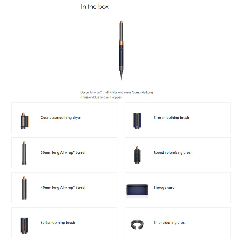 | اقلام همراه | -سری Coanda smothing dryer-سری ۳۰mm Airwrap long barrel-سری ۴۰mm Airwrap long barrel-سری Firm smoothing brush-سری soft smoothing brush-سری Round volumizing brush-کیف جیر دایسون-برس تمیزکننده فیلتر |