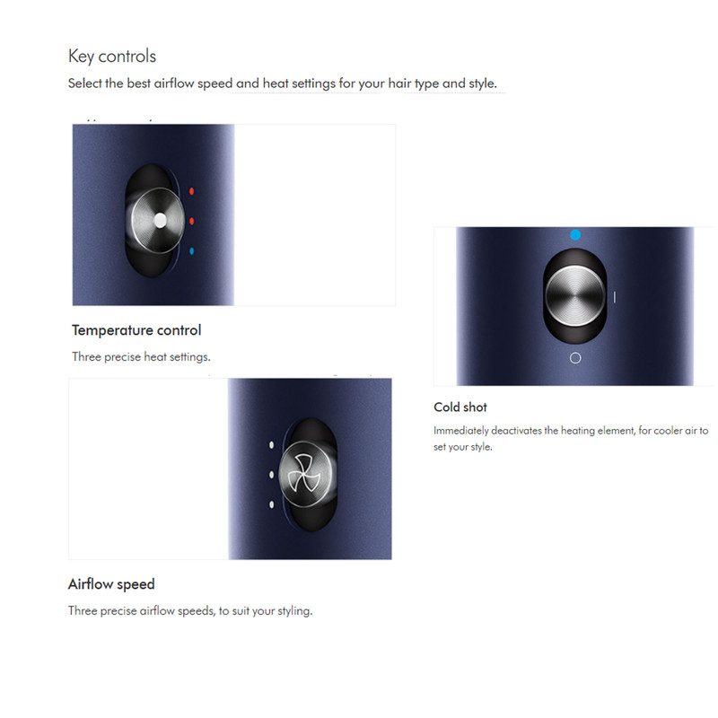 | سایر مشخصات | -موتور دیجیتال V9: با سرعت چرخش تا ۱۱۰٬۰۰۰ دور در دقیقه، جریان هوای قدرتمندی تولید میکند / توان مصرفی: ۱۳۰۰ وات / کنترل حرارت هوشمند: با اندازهگیری دمای هوا بیش از ۴۰ بار در ثانیه، از آسیب به موها جلوگیری میکند / تنظیمات حرارت و سرعت: سه سطح حرارت و سه سرعت جریان هوا برای تطبیق با انواع موها / عملکرد "Cold Shot": برای تثبیت حالت مو با هوای سرد / ایجاد یون منفی برای حذف الکتریسیته ساکن / برنده جایزه طراحی Allure Best of Beauty Award ۲۰۲۳ |