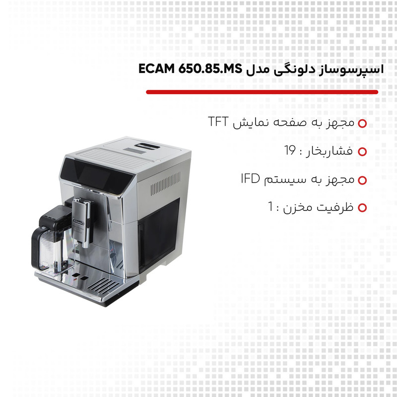 اسپرسوساز مدل ECAM 650.85.MS محصولی از برند « دلونگی » (Delonghi) است که با استفاده از آن میتوان انواع نوشیدنیهای گرم ازجمله اسپرسو، کافه لاته، موکا، کاپوچینو، شیر داغ و ... را با آن تهیه کرد. این محصول با طراحی زیبا و کیفیت ساخت بالا روانه بازار شده است. وزن این محصول در حدود 12.5 کیلوگرم است که در مقایسه با محصولات مشابه، سنگین محسوب میشود. جلوی دستگاه یک صفحهنمایش با سایز 4.3 اینچ قرار گرفته است. حداکثر فشار این دستگاه برابر با 19 بار است. قرار گرفتن سینی چکهگیردر قسمت پایین دستگاه از کثیفشدن سطح میز جلوگیری کرده و نظافت دستگاه را آسان میکند. همچنین قابلیت جداسازی این سینی و مخزن آب، نظافت آن بسیار راحت شده است. بهرهگیری از فناوری بلوتوث، سیستم IFD، قابلیت تمیز کردن خودکار و قابلیت خاموش شدن خودکار ازجمله ویژگیهای دیگر این محصول است. گفتنی است که این دستگاه توانسته است تا گواهی CE را نیز دریافت نماید.