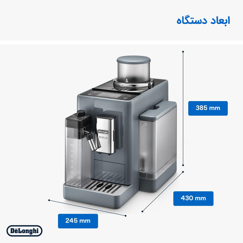 اسپرسوساز دلونگی مدل EXAM440.55 Rivelia یکی از پیشرفتهترین و کارآمدترین دستگاههای اسپرسوساز موجود در بازار است که با طراحی زیبا و عملکرد بینظیر خود، تجربهای متفاوت از تهیه قهوه را برای شما به ارمغان میآورد. این دستگاه با بهرهگیری از تکنولوژیهای پیشرفته و مواد با کیفیت، نه تنها قهوهای با طعم و عطر بینظیر تهیه میکند، بلکه به حفظ سلامت شما نیز کمک میکند. این دستگاه با توان مصرفی 1450 وات و فشار بخار 19 بار، قادر است به سرعت و با کارایی بالا قهوههای مختلف را تهیه کند. این ویژگی به خصوص برای خانوادههای پرجمعیت یا مهمانیها بسیار مناسب است. این اسپرسوساز دارای صفحه نمایش لمسی 3.5 اینچی با آیکونهای رنگی است که به شما امکان میدهد تنظیمات مختلف دستگاه را به راحتی انجام دهید. صفحه نمایش ساده و تعاملی به شما امکان دسترسی مستقیم و آسان به تمام نوشیدنیهای مورد علاقه شما، از اسپرسو گرفته تا کاپوچینو، لاته ماکیاتو را میدهد و پروفایلهای مربوط به هر نوع نوشیدنی را برای ذخیره و استفاده آسان در آینده، به راحتی شخصی سازی کرده و به شما کمک میکند تا در تهیه نوشیدنیهای مختلف در زمان خود صرفهجویی کنید. سیستم آسیاب دانه قهوه مجهز به 2 مخزن 250 گرمی دانه قهوه است که در بالای دستگاه نصب شده و میتوانید دو نوع دانه را در آن نگهداری کرده و امکان آسیاب دانههای قهوه را با 14 حالت مختلف به شما میدهد. با این 14 حالت مختلف و قطعات سرامیکی میتوانید متناسب با نوع نوشیدنی که میخواهید آماده کنید، دانههای قهوه را به بهترین شکل آسیاب کنید.