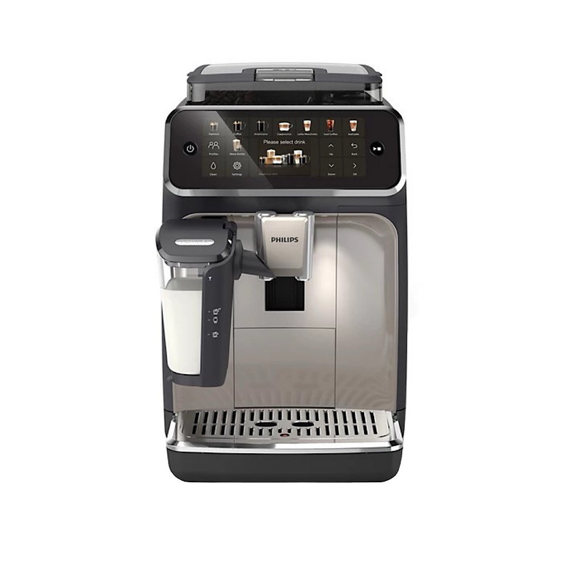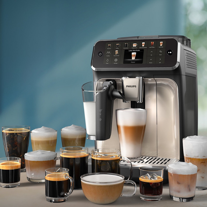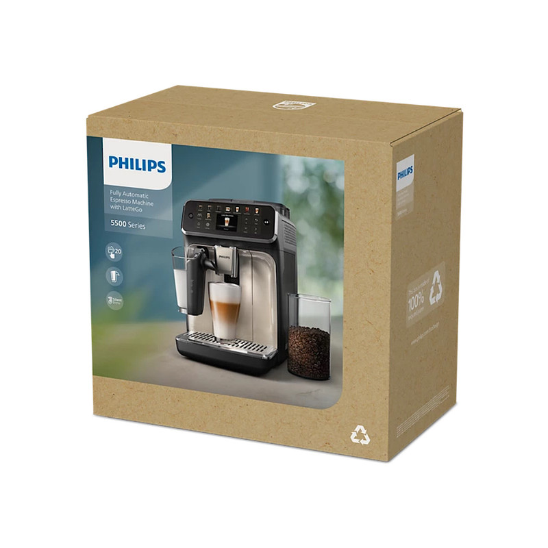 اسپرسو ساز فیلیپس مدل EP5547 (سری ۵۵۰۰) یک دستگاه تمامخودکار با طراحی مدرن و عملکرد حرفهای است که تجربهای عالی از قهوه را ارائه میدهد. آسیاب داخلی سرامیکی با تنظیم ۱۲ سطح، امکان انتخاب عطر و میزان آسیاب دقیق دانهها را فراهم میکند سیستم LatteGo با طراحی ساده شامل دو بخش است و بدون شلنگ داخلی میتوان فوم شیر ابریشکل تهیه کرد؛ تمیز کردن آن در کمتر از ۱۰ ثانیه امکانپذیر است فشار پمپ ۱۵ بار در فرآیند عصارهگیری، کرما و طعم واقعی اسپرسو را تضمین میکند مخزن آب ۱.۸ لیتری بزرگ امکان تهیه چندین فنجان را بدون نیاز به پر کردن مکرر فراهم میکند رابط کاربری با نمایشگر TFT و دکمههای لمسی، تا ۲۰ نوع نوشیدنی سرد و گرم را با گزینههای شخصیسازی ارائه میدهد فنآوری Aroma Extract برای تنظیم دقیق دما و عصارهگیری، و SilentBrew برای عملکرد کمصدا ارائه شدهاند. همچنین سیستم My Coffee Choice به کاربر امکان ذخیره تنظیمات دلخواه را میدهد در بررسیها این مدل بهخاطر کارایی، بازرسی صدای مناسب و کیفیت قهوه تحسین شده است؛ امتیاز ۸.۵ از ۱۰ گرفته و در آزمونها نمره «خوب» کسب کرده است