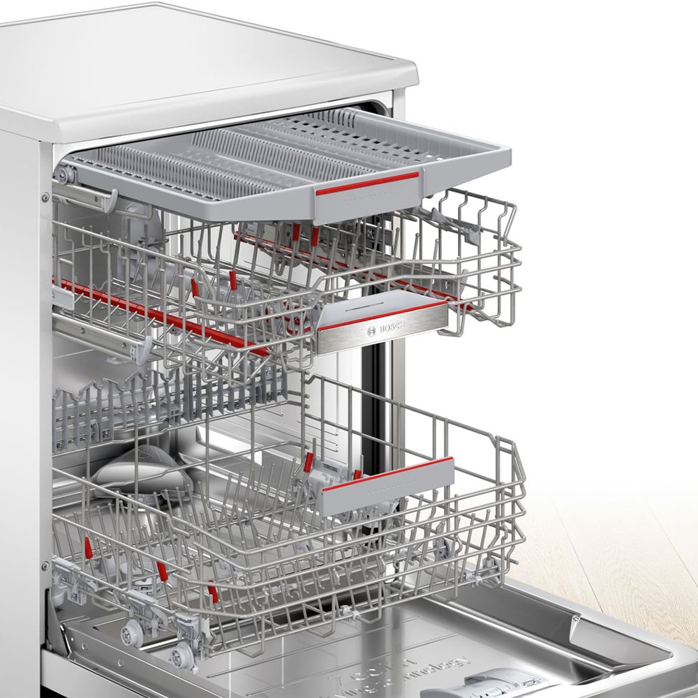 مشخصات فنی ظرفیت: 14 نفره نوع: ایستاده (Freestanding) با عرض 60 سانتیمتر رنگ: سفید سطح صدا: 42 دسیبل (بسیار کمصدا) کلاس مصرف انرژی: ++A تعداد برنامههای شستشو: 8 برنامه متنوع شامل: Auto 45–65°C Intensive 70°C Express 45°C Silence 50°C Express 60°C Glass 40°C Eco 50°C Favourite فناوریها و امکانات ویژه PerfectDry با فناوری زئولیت: خشککن قوی حتی برای ظروف پلاستیکی Home Connect: قابلیت کنترل از راه دور از طریق اپلیکیشن موبایل SpeedPerfect+: کاهش زمان شستشو بدون افت کیفیت IntensiveZone: افزایش فشار آب در سبد پایینی برای ظروف بسیار کثیف ExtraDry: افزایش دمای خشککن برای خشک شدن بهتر Silence on Demand: کاهش صدای دستگاه از طریق اپلیکیشن aquaStop: سیستم ایمنی ضد نشت آب Heat Exchanger: تبادل حرارتی برای محافظت از ظروف حساس طراحی داخلی Max Flex Baskets: سبدهای قابل تنظیم برای چیدمان آسانتر ظروف VarioDrawer: کشوی سوم برای قاشق، چنگال و فنجانهای کوچک AquaSensor: تشخیص میزان کثیفی آب برای صرفهجویی در مصرف تجربه کاربران بر اساس بررسیها، کاربران از عملکرد بیصدای این مدل، کیفیت بالای شستشو و خشککن آن، و قابلیتهای هوشمند مانند کنترل از راه دور رضایت دارند. همچنین، طراحی داخلی انعطافپذیر و سبدهای قابل تنظیم، چیدمان ظروف را آسانتر کرده است.