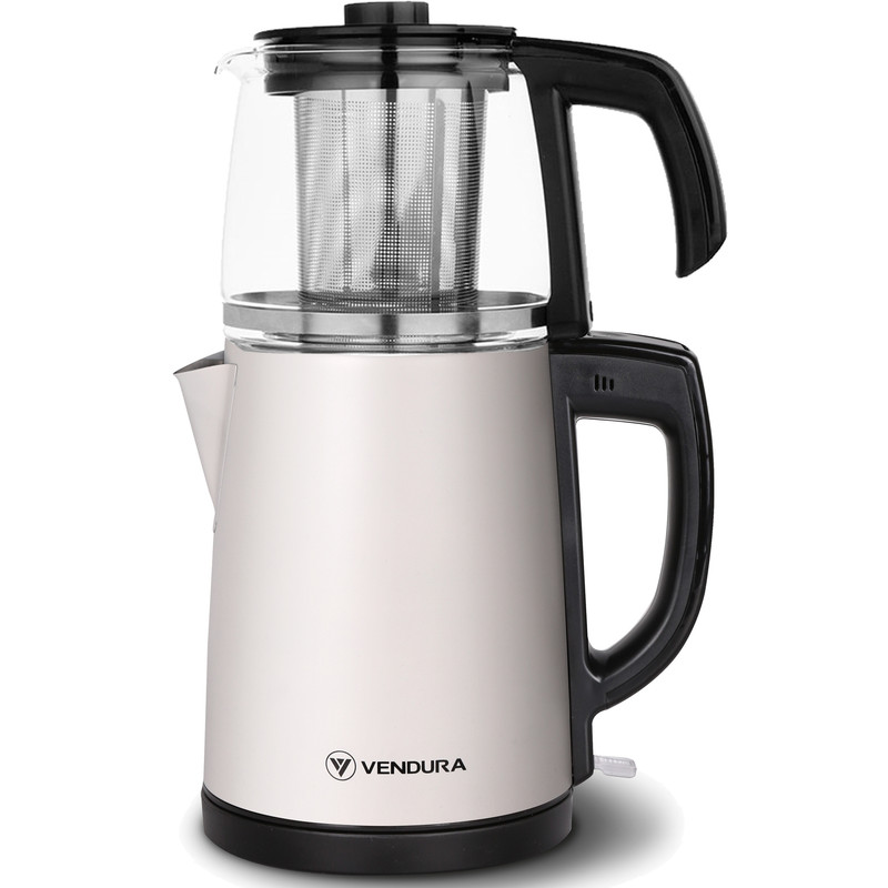 اگر به نوشیدن چای علاقه دارید باید چای ساز تهیه کنید. چای ساز وندورا مدل TF1210 یک چای ساز با کیفیت ساخت ترکیه است. ظرفیت کتری آب این مدل 1.8 لیتر و قوری 1 لیتر است. برای کتری این مدل از جنس استیل و قوری از شیشه استفاده شده است. استفاده از شیشه باعث شده تا بتوانید محتویات درون قوری را ببینید و نیازی باز کردن درب نداشته باشید. قوری و کتری این مدل روی هم قرار گرفته و این ویژگی باعث شده تا این چایساز فضای کمتری را اشغال کند. توان صرفی چایساز 1650 وات بوده که این میزان برای مصارف خانگی مناسب است. دستگیرهای که برای قوری و کتری تعبیه شده عایق حرارت بوده و باعث شده تا استفاده از این چایساز آسان باشد.