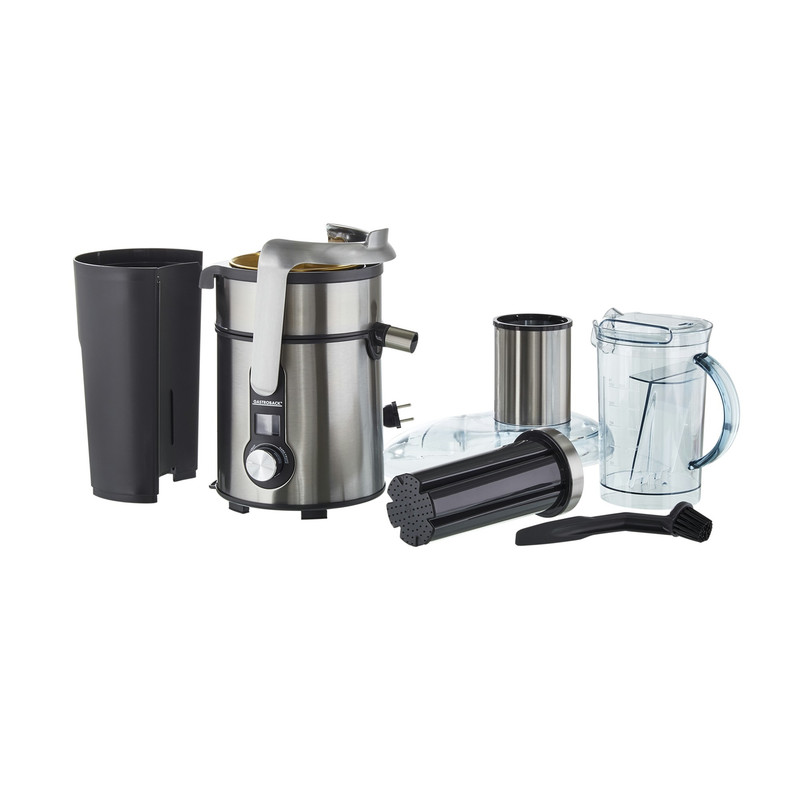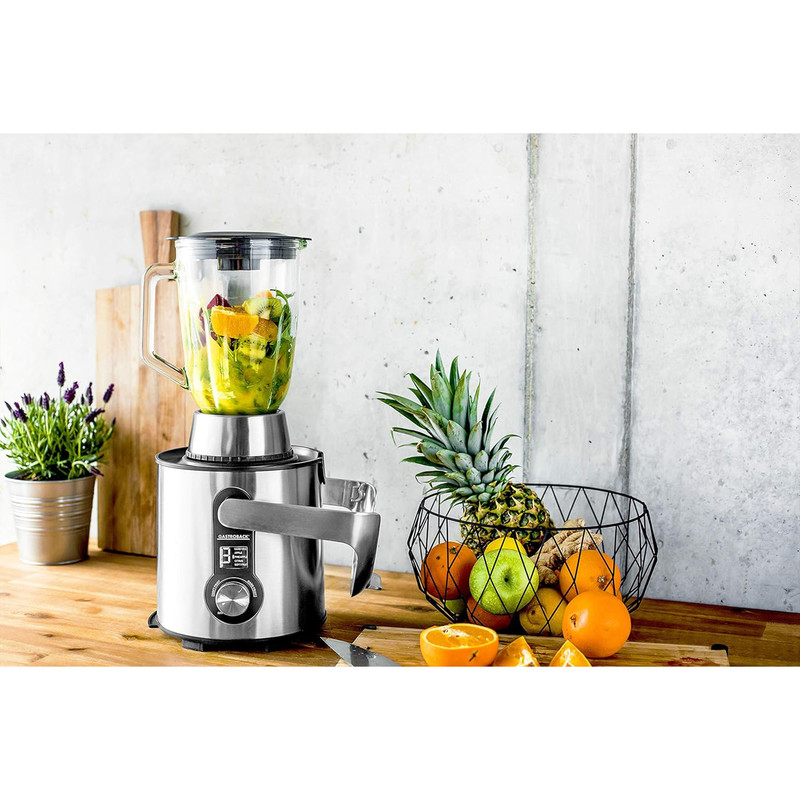کمپانی گاستروبک آلمان یکی از مطرح ترین کمپانیهای تولید لوازم برقی آشپزخانه است. از با کیفیت ترین محصولات گاستروبک میتوان به آبمیوهگیریهای آن اشاره کرد که در عین قدرت بالای موتورهایشان، بسیار کم صدا هستند. آبمیوهگیری گاستروبک مدل 40151 با توان مصرفی 1300 وات و بدنه استیل از جمله محصولات پرفروش این شرکت قلمداد میشود. این آبمیوهگیری با دهانهای بزرگ (84 میلیمتری) امکان آبگیری میوهها بدون برش زدن آنها را فراهم میکند. بر روی بدنه نمایشگر دیجیتال تعبیه شده است که میتوان از طریق آن میزان سرعت دستگاه را مشاهده کرد. جهت تهیه اسموتی، تیغه مخصوص اسموتی ساز از جنس استیل در کنار محصول قرار گرفته است. بدنه تمام استیل این دستگاه علاوه بر زیباتر کردن ظاهر آن، موجب افزایش کیفیت و دوام آبمیوه گیری گاستروبک مدل 40151 گردیده است، به طوری که این بدنه استیل در اثر استفاده و تماس با آبمیوههای قلیایی زنگ نزده و فرسوده نمیشود.