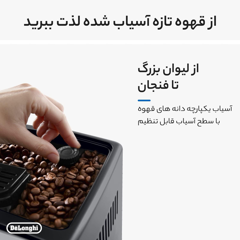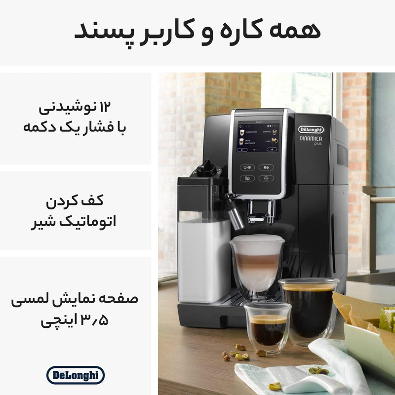 اسپرسوساز Dinamica Plus به راحتی هر زمان که میل اسپرسو داشته باشید تجربه یک کافی شاپ مجهز را برای شما تداعی میکند. صفحه نمایش رنگی با راهنمای کامل راه اندازی از صفر تا 100 شما را بی نیاز از هر گونه باریستا میکند تا به راحتی و با یک لمس بهترین نوشیدنی های قهوه را داشته باشید. آسیاب 13 حالته نیز داخل دستگاه گنجانده شده تا عطر و طعم قهوه را همان ابتدا به بهترین شکل تجربه کنید. به لطف رابط کاربری جدید و بصری در نمایشگر رنگی لمسی 3.5 اینچی TFT از تعامل آسان لذت ببرید. با استفاده از سیستم لمسی هوشمند ، Dinamica Plus برنامه ریزی شده تا بیشترین نوشیدنی های انتخاب شده شما را به ثبت برساند و به طور خودکار آنها را به عنوان اولین در پانل انتخاب شما لیست کند. سیستم ترموبلاک پیشرفته برای گرم کردن آب در دمای ایده آل برای تهیه قهوه در این دستگاه قرار گرفته است. همچنین سیستم منحصر به فرد LatteCrema از یک دستگاه اختلاط استفاده می کند که بطور خودکار یک کف شیر متراکم ، غنی و ماندگار را فراهم می کند - دقیقاً مانند یک باریستای حرفه ای در کافی شاپ. آسیاب فلزی مخروطی بهترین استخراج طعم و عطر را تضمین می کند. سیستم بدون لوله آسیاب مقدار خاک قهوه ای را که در مدار آسیاب قرار دارد را کاهش می دهد تا هر بار تازه ترین پودر را داشته باشد. با استفاده از دکمه My Function می توانید دستورالعمل ها را به راحتی تهیه و ذخیره کنید تا هر بار از فنجان کامل خود لذت ببرید: تغییر عطر و مقدار قهوه و مقدار شیر و کف را انتخاب کنید.