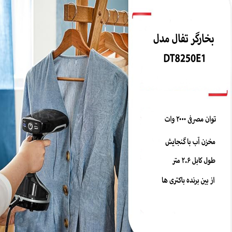 بخارگر تفال مدل DT8250E1 یا Access Steam Force، گزینهای عالی برای اتوکشی سریع، عمودی و افقی انواع لباس و منسوجات خانگی است. این دستگاه با توان ۲۰۰۰ وات و آمادهسازی اولیه در ۲۵ ثانیه، سریعاً شروع به تولید بخار ۳۰ گرم در دقیقه میکند و با بخار لحظهای (Turbo boost) تا ۹۰ گرم، حتی چروکهای مقاوم را بهسادگی صاف مینماید : مخزن جداشدنی ۲۰۰ میلیلیتری با قابلیت پر شدن هنگام کار، اجازه استفاده طولانی حدود ۱۰ دقیقه را فراهم میکند و کابل بلند ۲٫۶ متری به آزادی حرکت حین استفاده کمک میکند : کفی سرامیکی مقاوم و گرمشونده (heated soleplate) از ایجاد لکه مرطوب جلوگیری کرده و امکان استفاده مستقیم پس از بخاردهی را بدون انتظار فراهم میسازد : فناوری Smart Temp (تنظیم دما هوشمند) اجازه استفاده ایمن روی انواع پارچه، حتی ظریفترینها، بدون تنظیم مجزا را میدهد : برس میکروفایبر همراه دستگاه، در یک مرحله هم بخاردهی، هم ضدعفونی و جمعآوری گردوخاک و پرز را انجام میدهد : همچنین، بخارگر مجهز به سیستم خاموشی خودکار و دو دکمه بخار (Delicate برای پارچههای سبک و Turbo برای پارچههای ضخیم) است که کنترل کامل کاربر را فراهم میسازد : در مجموع، DT8250E1 ترکیبی از سرعت، قدرت، ایمنی و طراحی هوشمندانه است که برای خانوادهها، سفر یا نگهداری مرتب لباسها بسیار مناسب است.