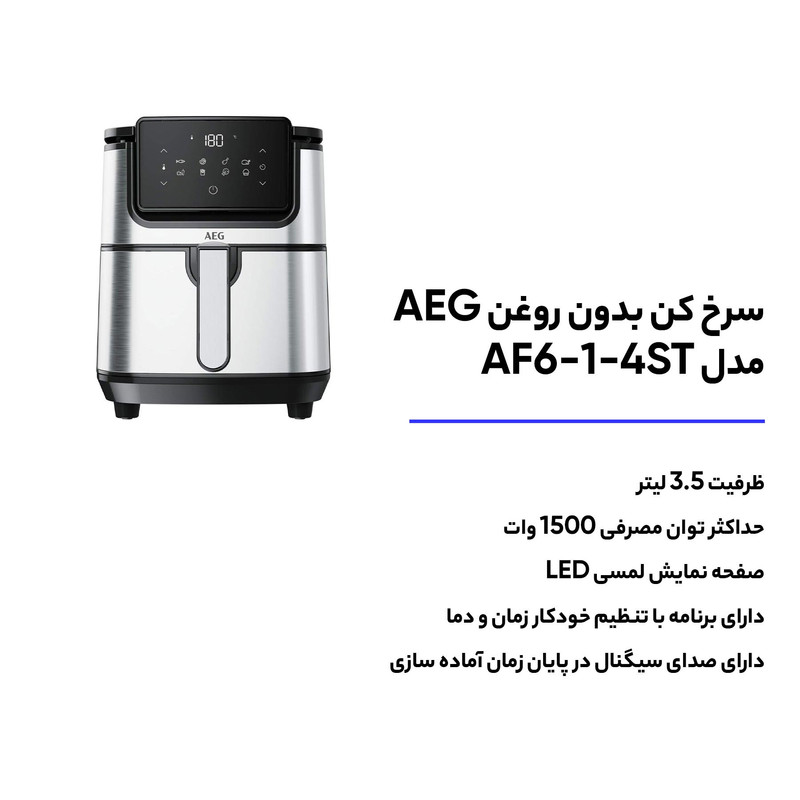 **سرخکن بدون روغن آاگ مدل AF6-1-4ST** این دستگاه با ظرفیت 1.4 کیلوگرم و توان 1500 وات طراحی شده است که برای خانوادههای 4 تا 5 نفره مناسب میباشد. محصول از فناوری Circulon بهره میبرد که امکان پخت یکنواخت غذا بدون نیاز به روغن را فراهم میآورد. ویژگیهای اصلی شامل پنل لمسی دیجیتال با قابلیت تنظیم دما بین 80 تا 200 درجه سانتیگراد، 6 برنامه از پیش تنظیم شده برای انواع غذاها و سیستم چرخش خودکار برای پخت یکنواخت میباشد. سینی ضدچسب دستگاه دارای پوشش با کیفیت بوده و تمام قطعات آن قابل شستشو در ماشین ظرفشویی هستند. این سرخکن برای تهیه انواع غذاها شامل سیبزمینی سرخکرده، مرغ، ماهی و سبزیجات مناسب است. طراحی جمعوجور دستگاه آن را برای استفاده در فضای آشپزخانه مناسب ساخته است. محصول با گارانتی 2 ساله و استانداردهای ایمنی اروپا عرضه میشود. از مزایای این مدل میتوان به کاهش 85 درصدی چربی در غذاهای تهیه شده، مصرف انرژی بهینه و عملکرد بیصدا اشاره کرد. بستهبندی محصول شامل دستگاه اصلی، سینی سرخکن، کتابچه راهنما و مدارک گارانتی میباشد. ابعاد دستگاه 35 در 35 در 30 سانتیمتر و وزن آن 5.2 کیلوگرم است.