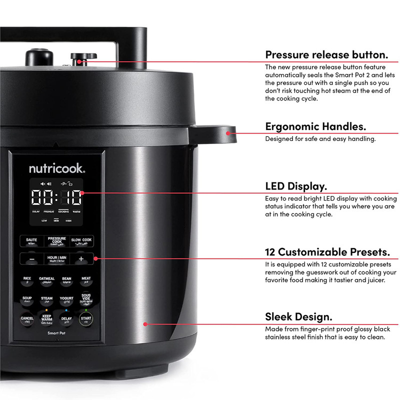 | سایر مشخصات | برنامه ها ( pressure cooker, sauté , slow cook , rice ,Oatmeal ,Bean , Meat , soup , steam , yogurt , sous vide , Keep warm and Delay ) ( زودپز، سرخ کن و تفت دهی، آرام پز، برنج، بلغور جو دوسر، لوبیا، گوشت، سوپ، بخارپز، ماست، پخت مواد غذایی داخل کیسه ، گرم نگه داشتن و پخت با تاخیر) / دستگاه طراحی و مهندسی نوتریبولت در کالیفرنیا اسمبل در چین |
