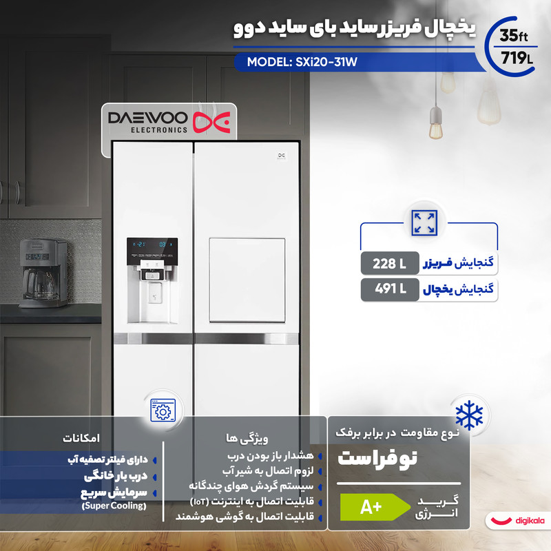 یخچال فریزر ساید بای ساید ۳۵ فوت دوو مدل SXi20-31W، با ارائهی گنجایش فوقالعاده، طراحی زیبا و مدرن در رنگ سفید، مجموعهای کامل از پیشرفتهترین فناوریهای خنککننده و حفظ تازگی، و امکانات هوشمند منحصربهفرد مانند "چشم الکترونیکی هوشمند"، "درب سوم با سرمایش فلزی" و "سامانه خودکار بسته شدن دربها"، یک انتخاب بینظیر و سرمایهگذاری ارزشمند برای خانوادههای بزرگ ایرانی یا افرادی است که به دنبال نهایت فضا، کیفیت، تکنولوژی، راحتی و زیبایی در آشپزخانهی خود هستند. این یخچال فریزر، فراتر از یک وسیلهی سرمایشی، یک دستیار هوشمند و زیبا در قلب خانهی شماست که طراوت، سلامت و آسایش را برای خانواده به ارمغان میآورد و سبک زندگی مدرن شما را تکمیل میکند.