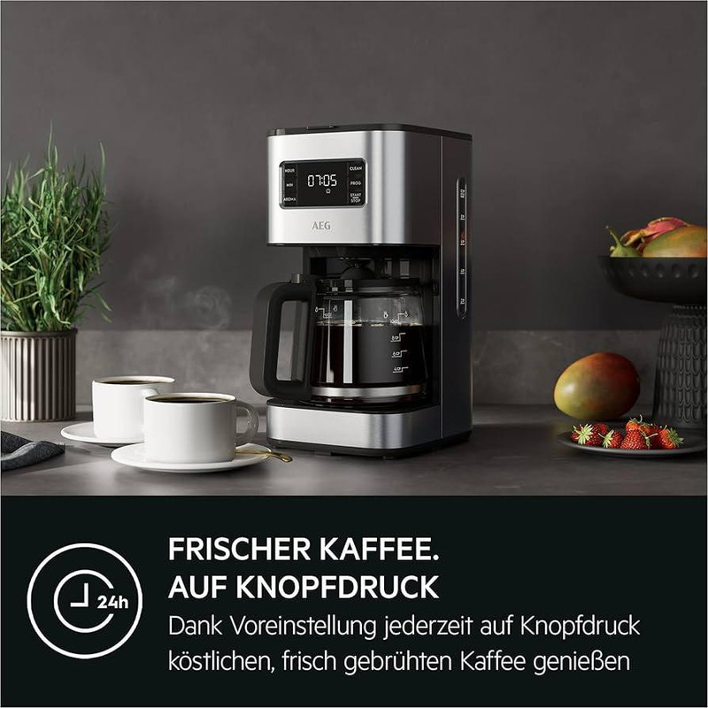 قهوهساز آ.ا.گ مدل CM5‑1‑6ST با ظرفیت ۱.۲۵ لیتر، توان ۱۰۰۰ وات، تایمر ۲۴ ساعته، فیلتر قابل شستشو و طراحی استیل ضدزنگ، گزینهای مناسب برای تهیه قهوه با طعم دلخواه است.
