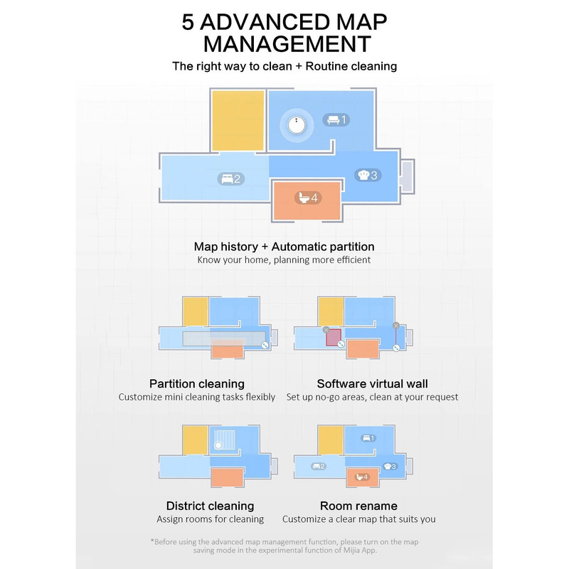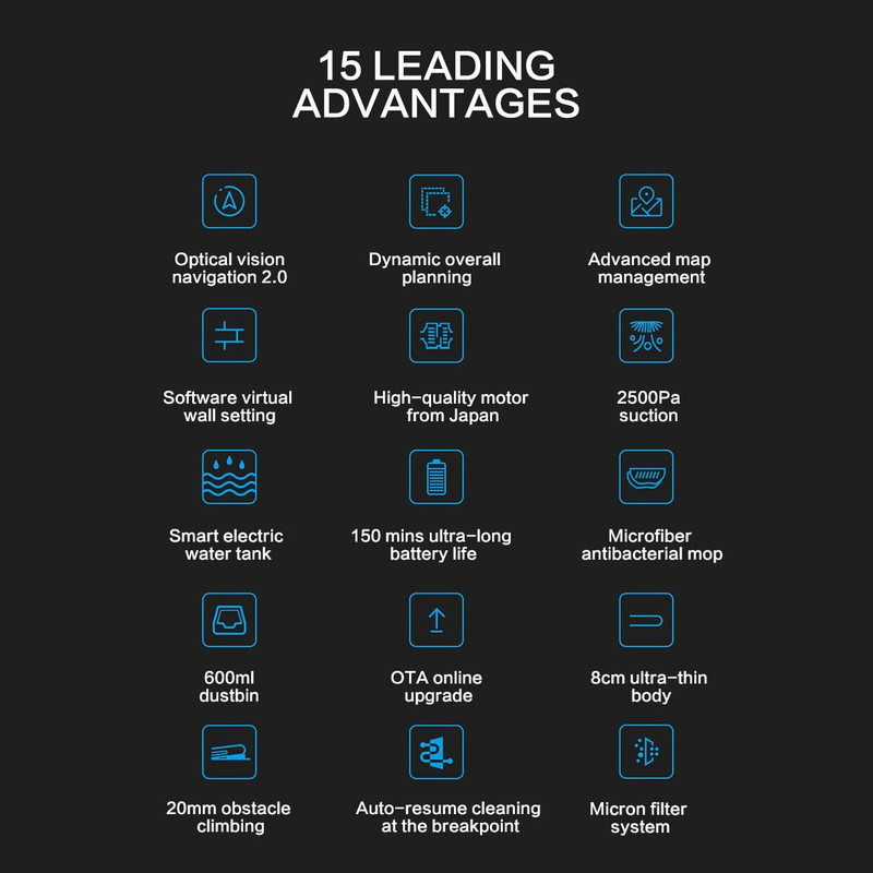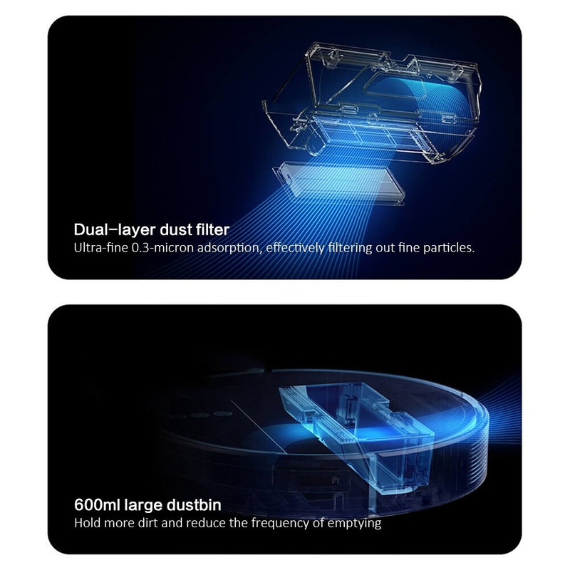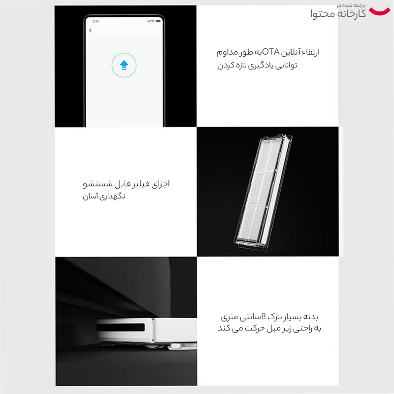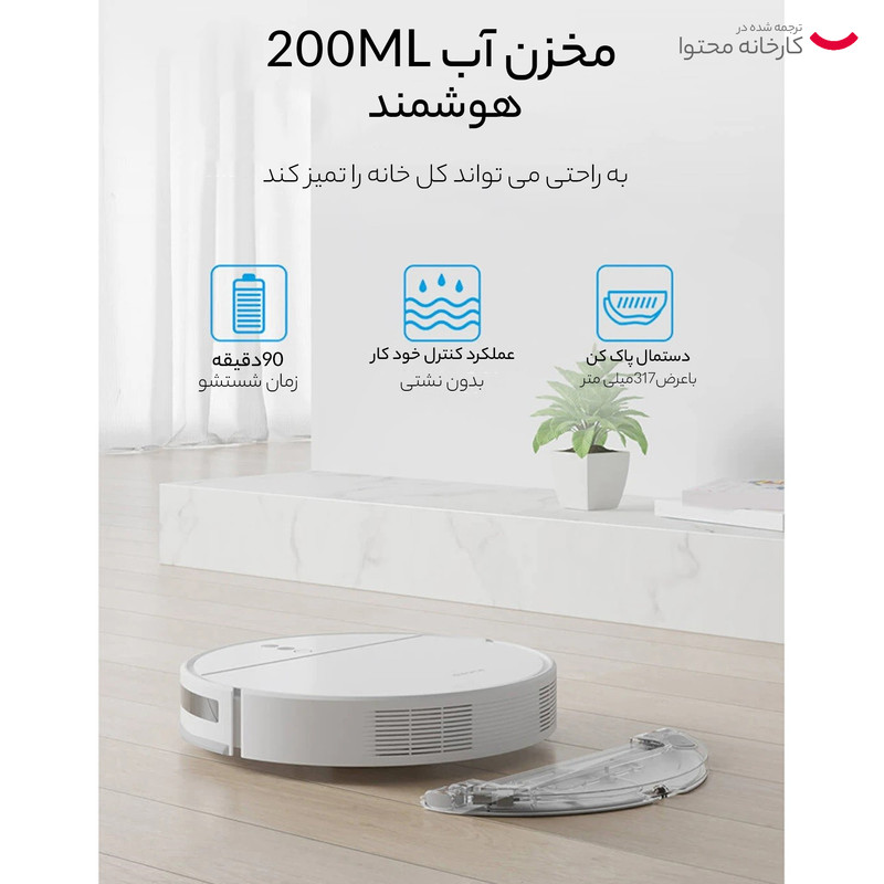 | سایر توضیحات | مدیریت از طریق نرم افزار mi homeدارای مخزن آب با قابلیت کنترل میزان آب خروجیقابلیت طی کشی و جارو زدن به صورت هم زماندارای دید ماشینی نسل دومقابلیت نقشه کشیقابلیت اتصال به اینترنتقابلیت ایجاد دیوار مجازیقابلیت طی کشی منطقه ایقابلیت جارو زدن منطقه ایموتور نایدک ساخت ژاپنقابلیت مکش توربوقابلیت بازگشت به داک شارژ به صورت خودکاردارای برس الکترونیکی چرخان برای جمع آوری موپوشش دهی 250 متر مربع با یکبار شارژ |