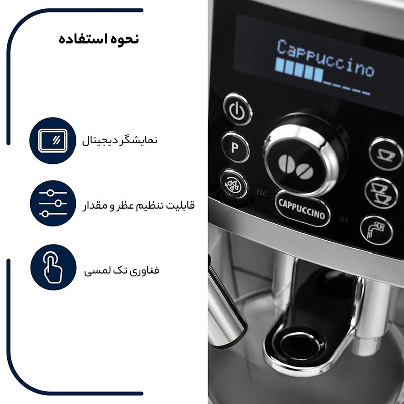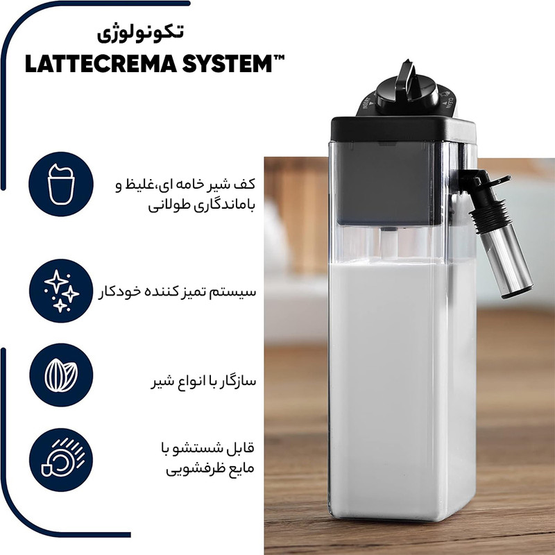 | سایر توضیحات | - 13 حالت آسیاب قهوه- سیستم لاته کرما دلونگی- برنامه ریزی سختی آب- نمایشگری 2 خطی |