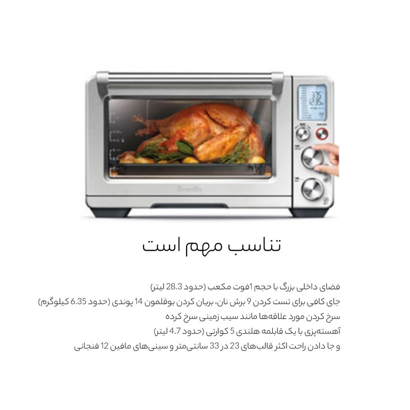 | مشخصات قفسه | گنجایش 22 لیتر توستر 6 تکه، ظرف پیتزا 30 اینچی، سینی مافین 9 عددی و یک عدد مرغ کامل |