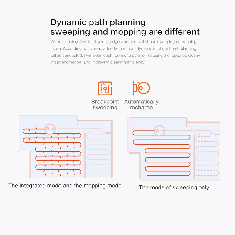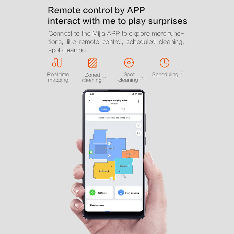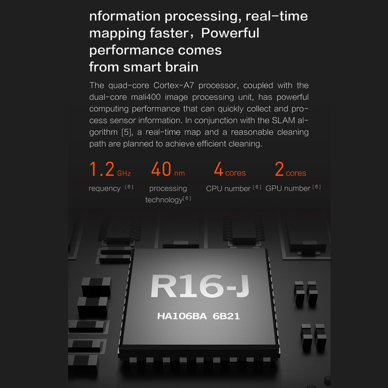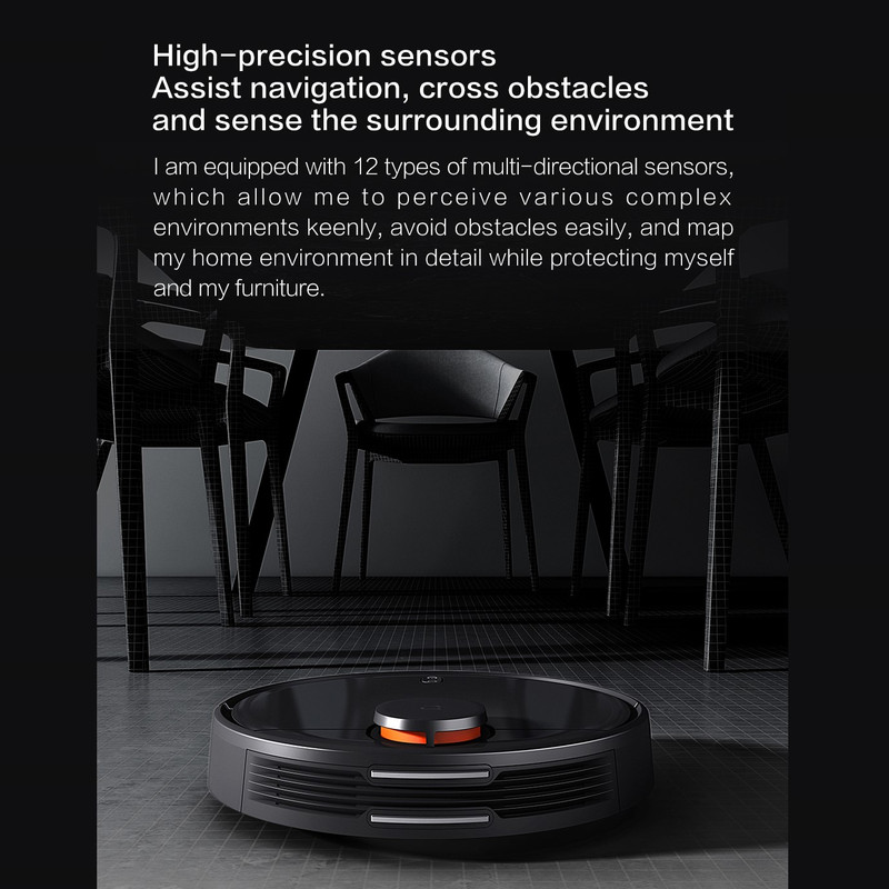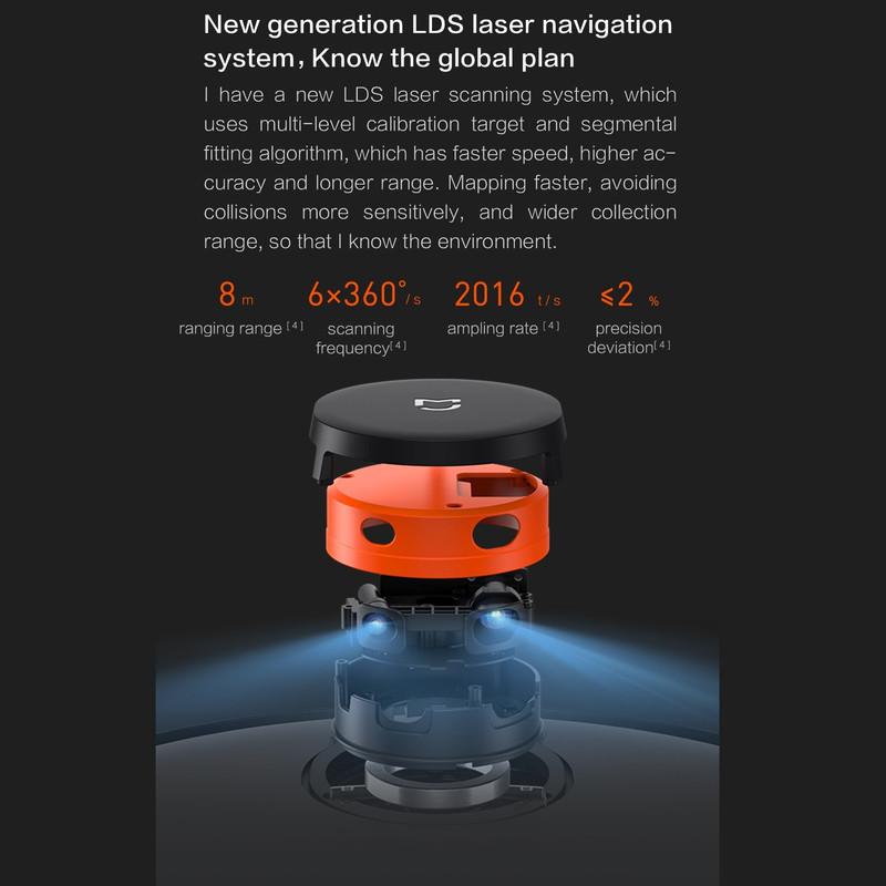 سیستم ناوبری لیزری LDS با سرعت و دقت بالا محدوده خود را اسکن کرده موانع را تشخیص داده و با شناسایی مسیر به سراغ تمیزکاری میرود. داشتن پردازنده Cortex-A7 و بهره گیری از 4 هسته پردازشی و پردازنده گرافیکی Mali 400 به همراه سنسورهای LDS باعث میشود تا جاروبرقی رباتیک شیائومی، در یک ثانیه 6 بار شعاع 8 متری خود را بصورت 360 درجه اسکن کرده و بسیار هوشمندانه از خانه شما نقشهبرداری کند؛ همچنین با توجه به الگوریتم SLAM میتواند نقشهها را در لحظه ایجاد کرده و مسیر مناسبتری را برای تمیز کاری پیدا کند و در مجموع 12 سنسور مختلف مادون قرمز در اطراف این جاروبرقی تعبیه شده تا بتواند براساس مسیرهای طی شده نقشه مجازی از خانه شما طراحی کند. این دستگاه به وسیله این سنسورها، دیوارکشی و لبههای اشیا و حتی پرتگاهها را شناسایی کرده و تا فاصله 10 میلیمتری به آنها نزدیک میشود؛ همچنین این دستگاه به دلیل داشتن دو چرخ پلاستیکی، به راحتی میتواند موانع تا 2 سانتیمتری را رد کند.