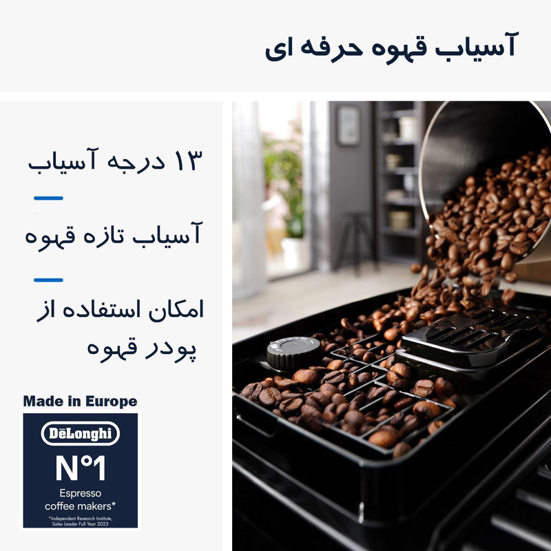✨ ایستگاه/سایر امکانات: آسیاب داخلی با ۱۳ درجه تنظیم، مخزن آب ۱.۸ لیتری، مخزن دانه قهوه ۲۵۰ گرمی، مخزن شیر جداشونده، سینی چکهگیر قابل شستوشو، سیستم شستوشوی خودکار نازل شیر.