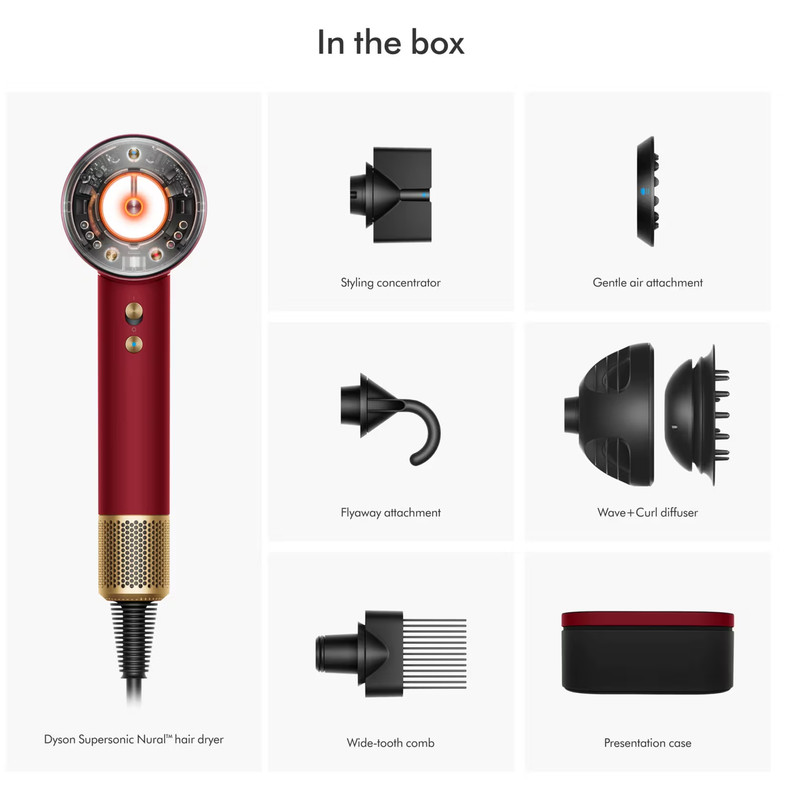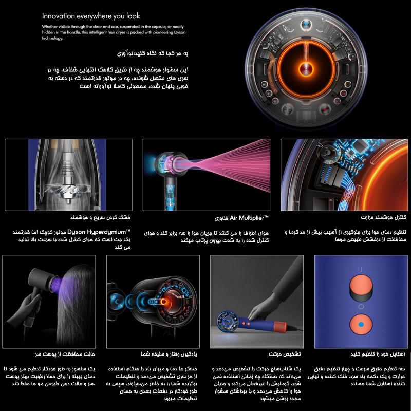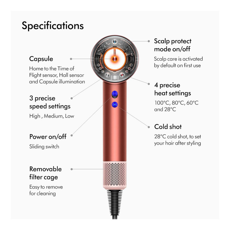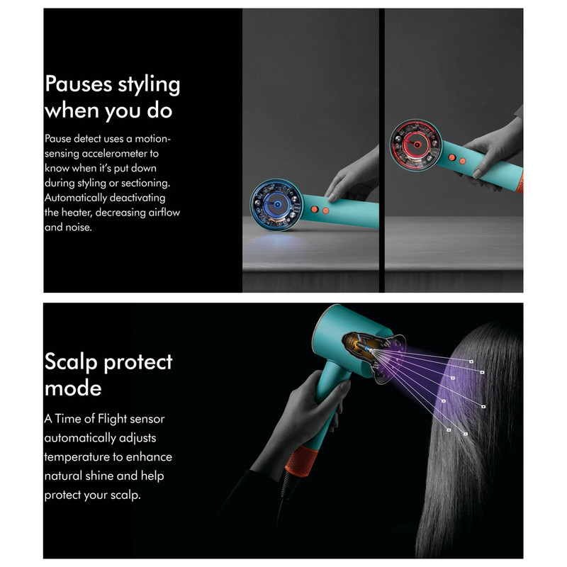 | سایر مشخصات | دارای تکنولوژی Sclap Protect برای حفظ رطوبت پوست سر / دارای سنسور تشخیص میزان فاصله سشوار از سر برای کاهش یا افزایش میزان دما به صورت خودکار جهت عدم آسیب رساندن به پوست و موی سر / دارای سنسور ژیروسکوپ برای تشخیص قرار گیری در حالت سکون و استفاده / Auto Pause جهت کاهش باد به حداقل میزان ممکن در حالت سکون و قرار گیری بر روی میز / Auto Power برای خاموش شدن خودکار سشوار در صورت عدم استفاده و روشن شدن مجدد در هنگام برداشتن / دارای هوش مصنوعی جهت یاد آوری تنظیمات سلیقه ای کاربر در میزان گرما و شدت باد برای هر کدام از نازل ها / تغییر نور داخلی با میزان حرارت تولیدی / فیلتر قابل جداسازی و شستوشو / برنده جایزه Allure Best of Beauty سال 2024 |