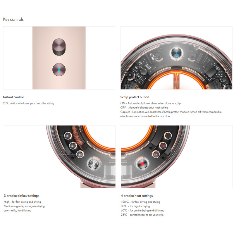 ✨ قدرت مکش/توان: مجهز به موتور دیجیتال Dyson V9 با توان ۱۶۰۰ وات و سرعت چرخش ۱۱۰٬۰۰۰ دور در دقیقه، تولید جریان هوای پرقدرت و کنترلشده برای خشککردن سریع مو.