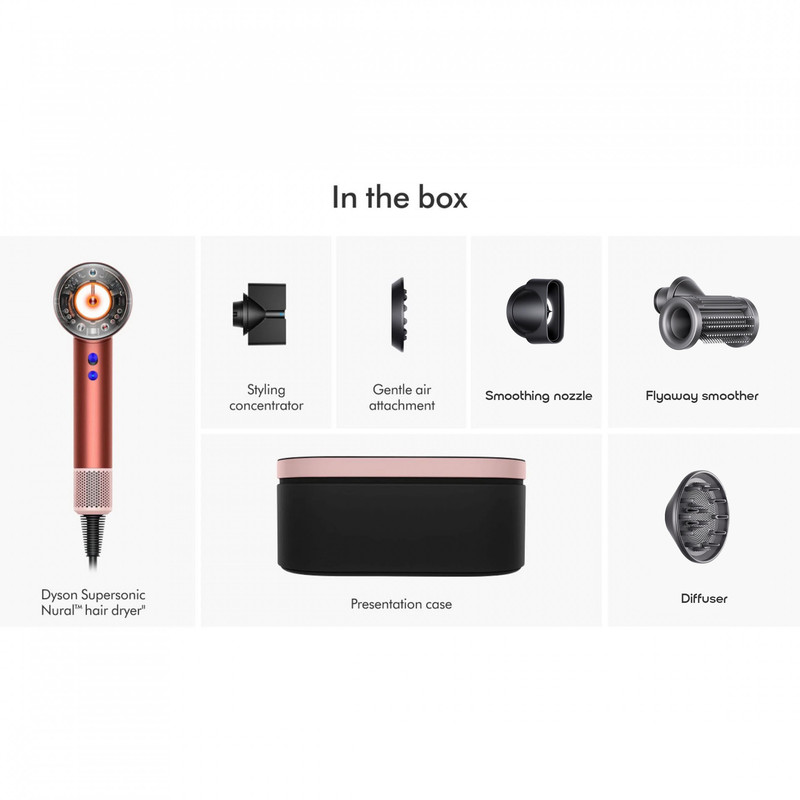 ✨ باتری/شارژ: دستگاه باسیم است و نیازی به شارژ ندارد، کابل ۲.۶ متری با قابلیت چرخش برای استفاده راحت در هر زاویه. ✨ صدا: طراحی کمصدا با نویز کمتر از سشوارهای سنتی، مناسب برای استفاده خانگی و حرفهای بدون مزاحمت صوتی. ✨ جمعبندی: Dyson Supersonic Nural ترکیبی از قدرت، هوشمندی و طراحی حرفهای است؛ با سنسورهای محافظتی، موتور قدرتمند و سریهای متنوع، تجربهای بینقص از خشککردن و حالتدهی مو را فراهم میکند.
