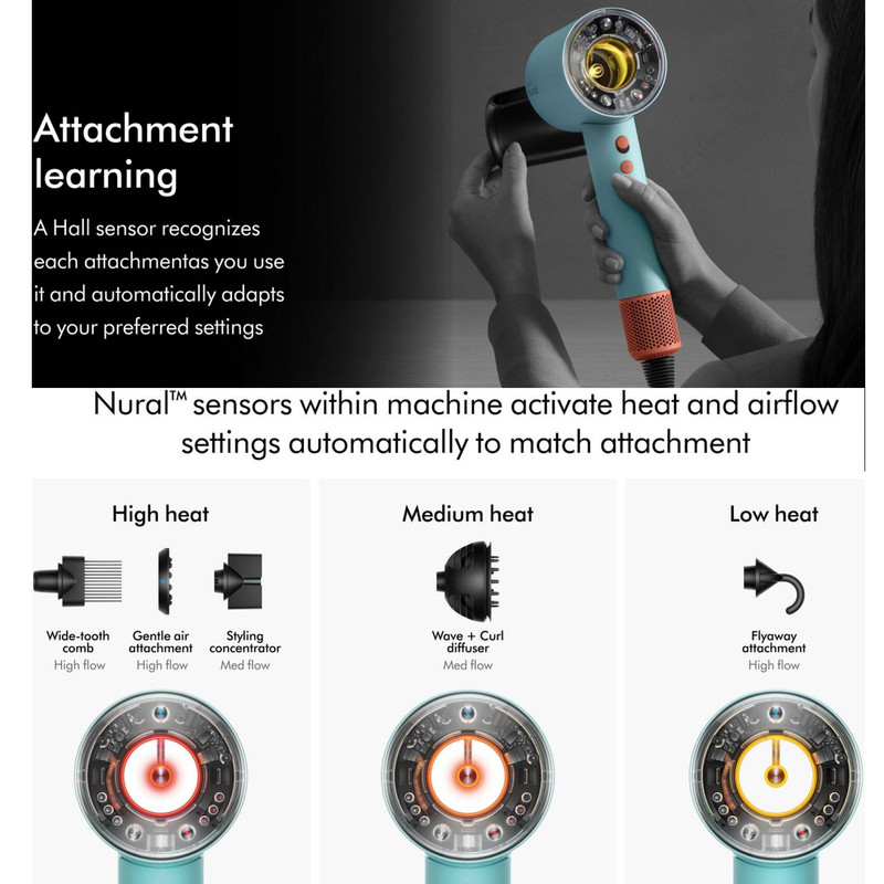 ✨ مسیریابی/کنترل: مجهز به فناوری Nural با سنسور ژیروسکوپ و فاصلهسنج، تنظیم خودکار دما بر اساس فاصله از پوست سر، مناسب برای حفظ سلامت موهای رنگشده یا آسیبدیده.